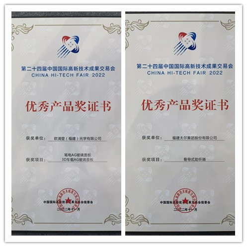 通过外贸转型升级,在构建开放型经济新体制、培育国际经济合作竞争新优势等方面的成果。经专家评审,我们福建太尔集团股份有限公司的骨导式助听器、欧普登(福建)光学有限公司的3D车载AG玻璃盖板获得了第二十四届中国国际高新技术成果交易会优秀产品奖。