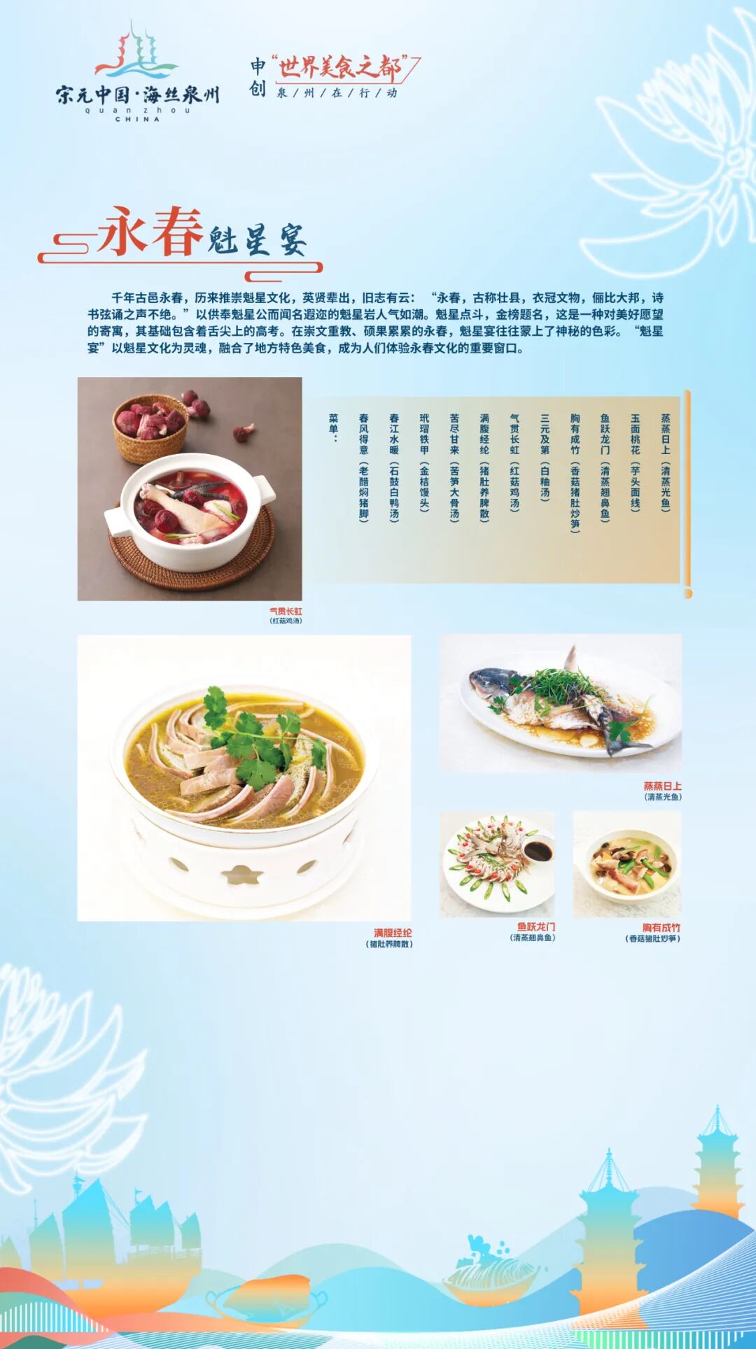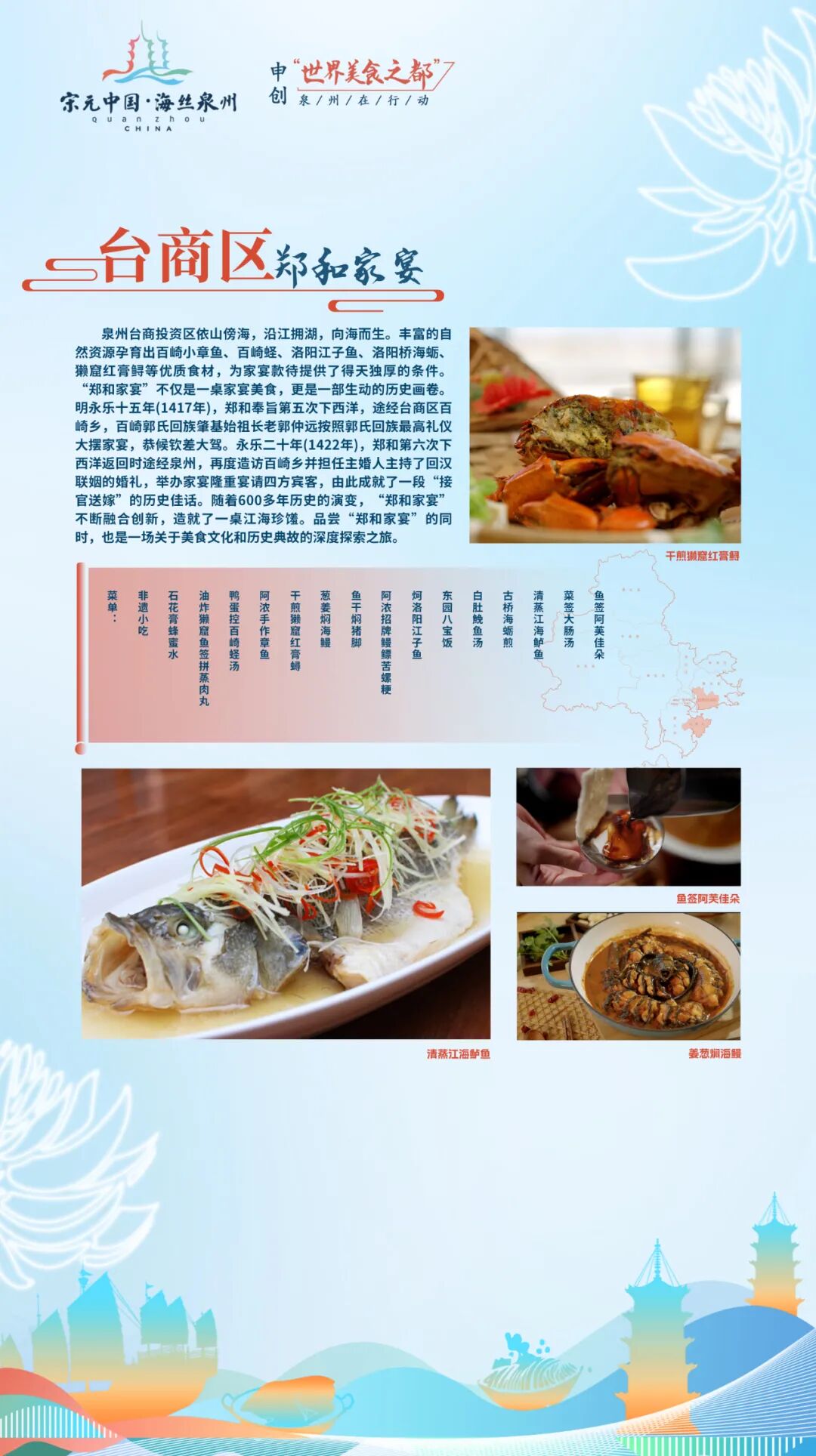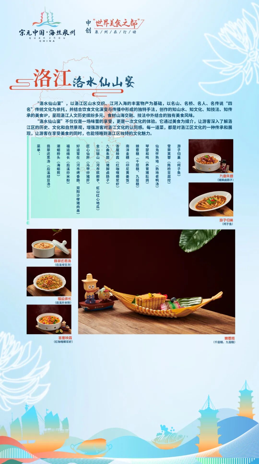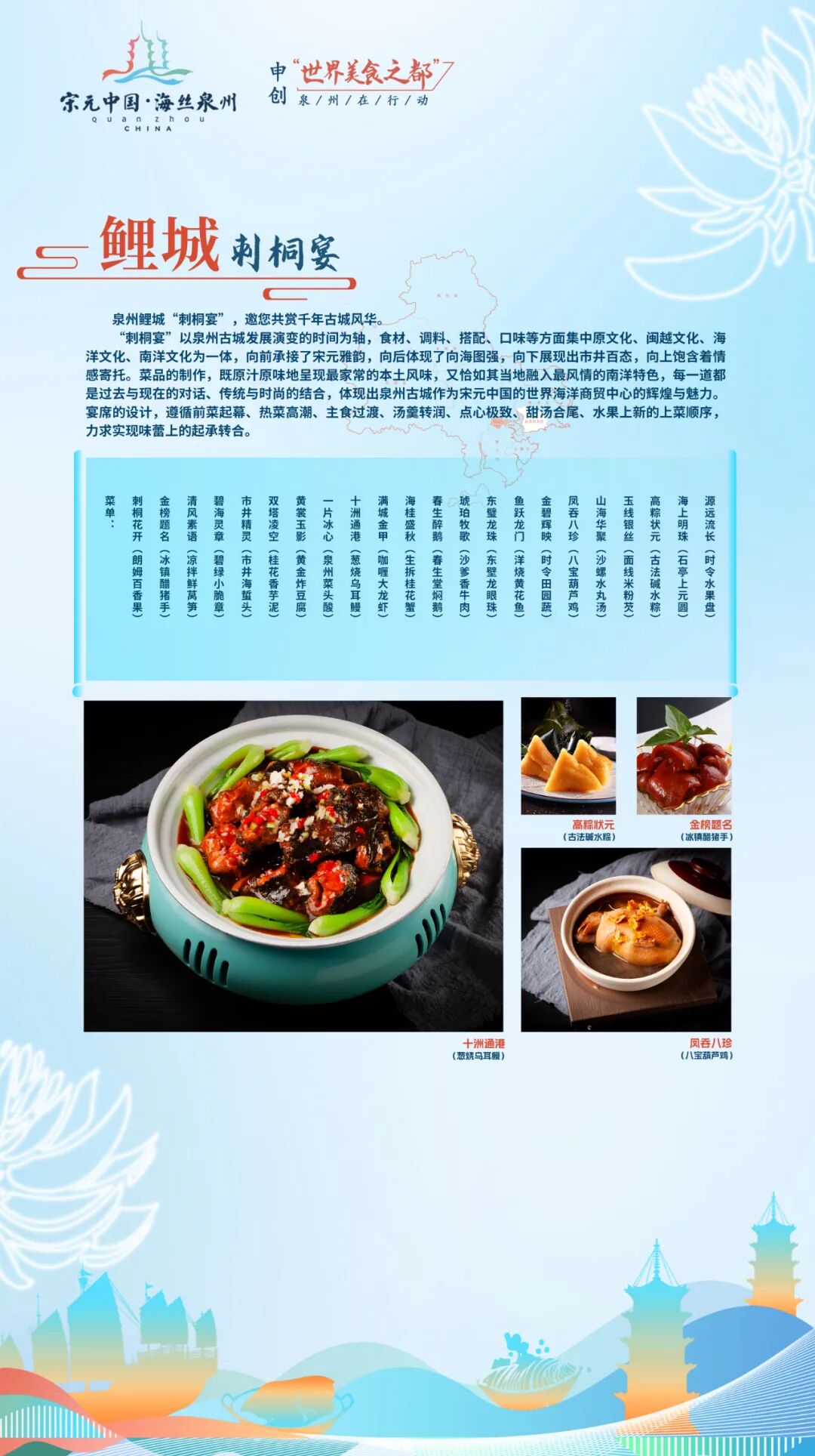 “刺桐宴”以泉州古城发展演变的时间为轴,集中原文化、闽越文化、海洋文化、南洋文化为一体,体现泉州古城作为宋元中国的世界海洋商贸中心的辉煌和魅力。
