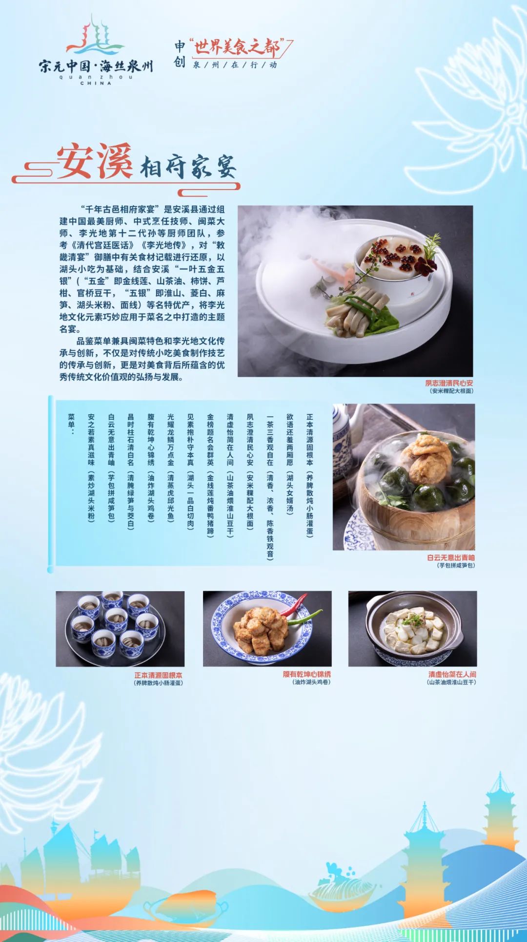 相府家宴以湖头小吃为基础,结合安溪“一叶五金五银”等名特优产,将李光地文化元素巧妙运用于菜名之中。
