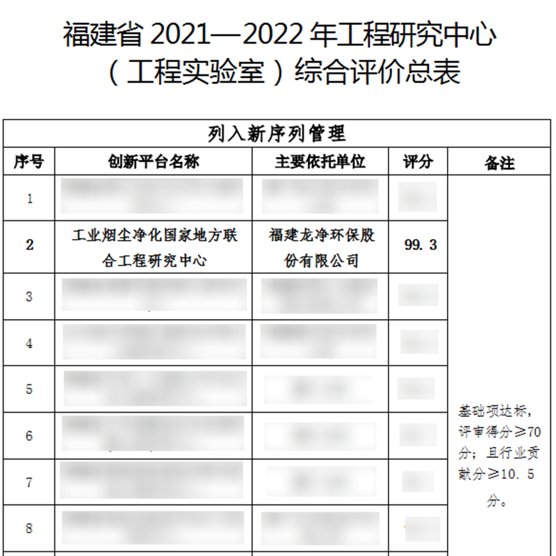 近日,福建省发展和改革委员会公布了2021-2022年度工程研究中心(工程实验室)评价结果,依托龙净环保建立的“工业烟尘净化国家地方联合工程研究中心”经过主管部门审查、专家评审,以99.3分的成绩在全省128家参评单位中位列第二,顺利通过评价!