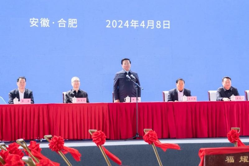 2024年4月8日上午10点,福耀集团安徽全产业链生产基地项目开工仪式在合肥市肥西县隆重举行。安徽省委书记、省人大常委会主任韩俊出席,并宣布项目开工,安徽省委副书记、省长王清宪,安徽省委副书记、政法委书记虞爱华,安徽省委常委、合肥市委书记张红文,安徽省委秘书长、省人大常委会副主任张韵声,合肥市委常委、常务副市长张泉,中国工程院院士、中国建材集团首席科学家、中建材玻璃新材料研究总院党委书记、院长彭寿,中建七局党委常委、副总经理林向武,以及福耀集团董事长曹德旺、总裁叶舒等集团管理层出席活动,安徽省政府秘书长潘朝晖主持仪式。出席活动的领导嘉宾共同培土奠基。