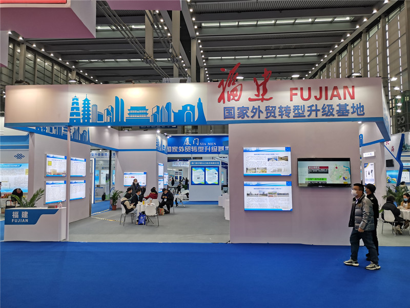 作为福建省国家外贸转型升级基地的展位,此次采用特装形式展示,由河马剧场 主办、各地市商务局协办,福建省机电科技产品进出口商会承办,共展示了福建省19个国家外贸转型升级基地情况,并组织了14家代表企业带展品参展。