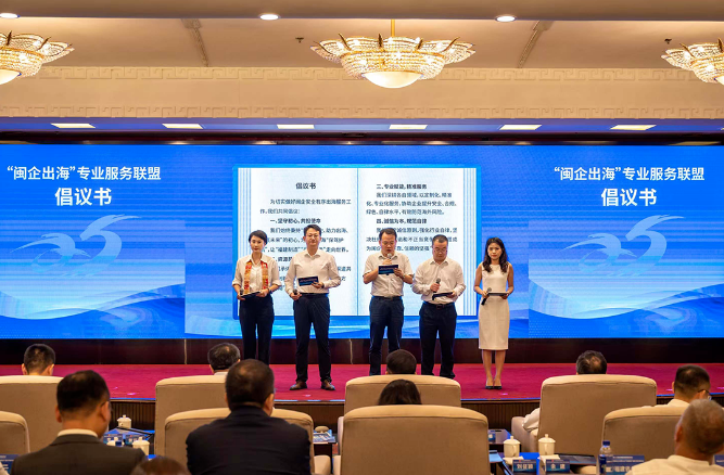 中国出口信保福建分公司、中行福建省分行、北京大成福州律所、厦门航空、深圳万企帮等成员单位代表宣读服务倡议:一是始终秉持“服务闽企、助力出海、共赢未来”的初心,把支持福建企业走向世界作为共同使命;二是加强成员单位间资源共享、互补合作,为企业提供“一站式、全方位、全周期”的专业服务;三是以企业需求为导向,不断提升专业服务水平,助力闽企在全球化道路上行稳致远;四是坚守诚信原则,加强行业自律,让联盟成为闽企出海可靠、信赖的坚强“后盾”。