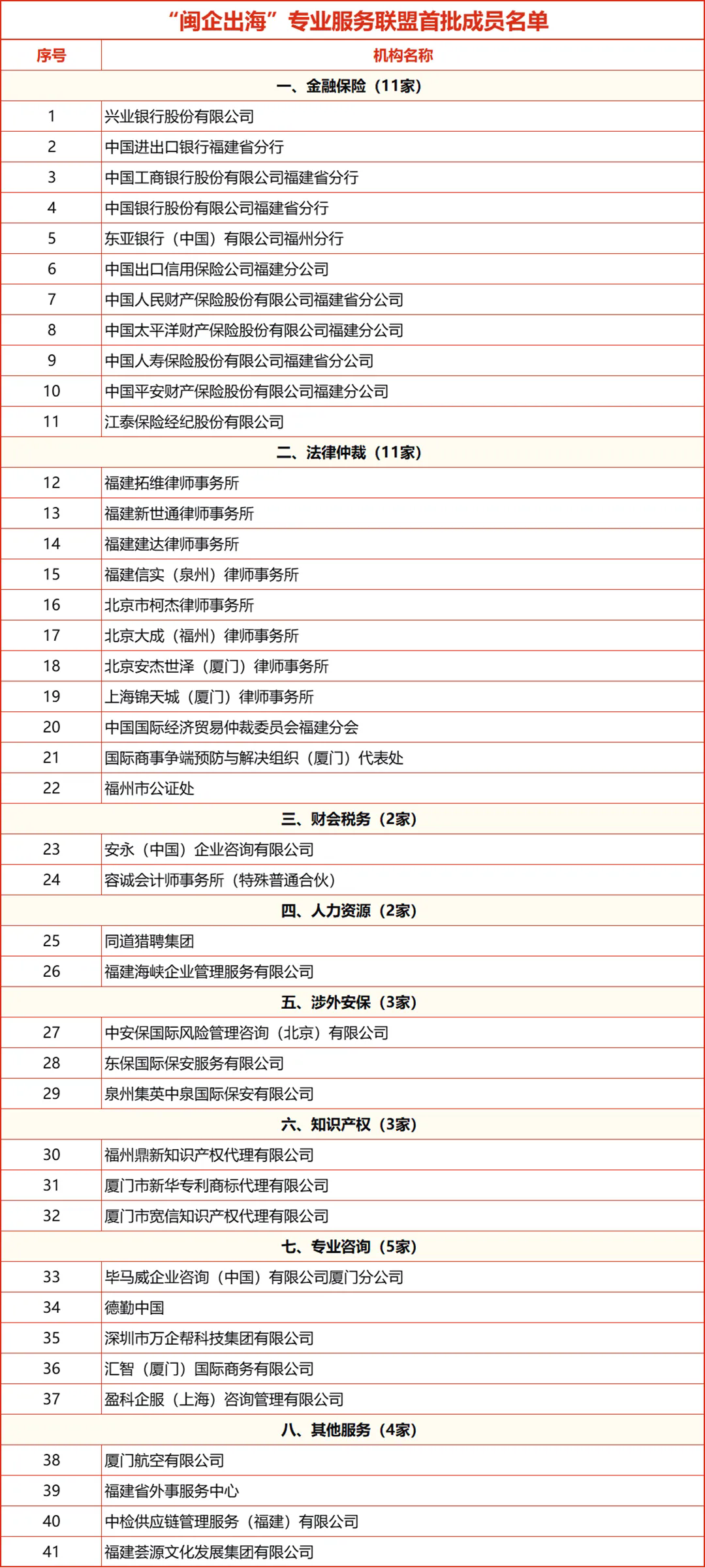 、发改委、工信厅、司法厅、外办、市场监管局、侨联、贸促会、工商联、外管局等10家单位作为指导单位,为联盟运作提供政策指导与支持。联盟首批成员单位41家,涵盖金融保险、法律仲裁、财会税务等10多个领域。联盟是一个开放的协作机制,下一步将吸纳更多有志于服务闽企出海的专业机构,不断壮大联盟成员队伍,持续拓展联盟服务领域。