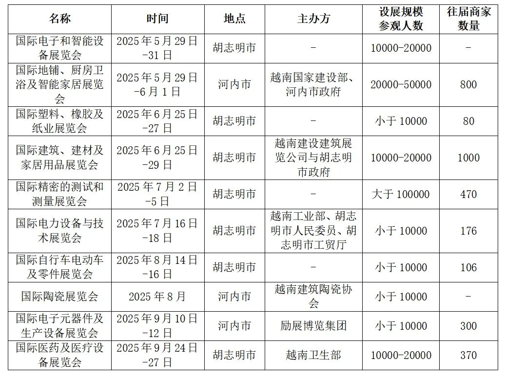 2025至2026年,越南计划组织约110场展会,涉及行业包括机械/五金/工业(18场)、建材/石材/照明/暖通(16场)、化工/环保/能源(13场)、纺织/服饰/鞋革(11场)、食品/果蔬/饮料/酒(7场)。2025年第二季度,值得关注的展会有越南国际电子和智能设备展览会(VIETNAM INTERNATIONAL ELECTRONICS & SMART APPLIANCES EXPO),将于2025年5月29日至31日在胡志明市举办。