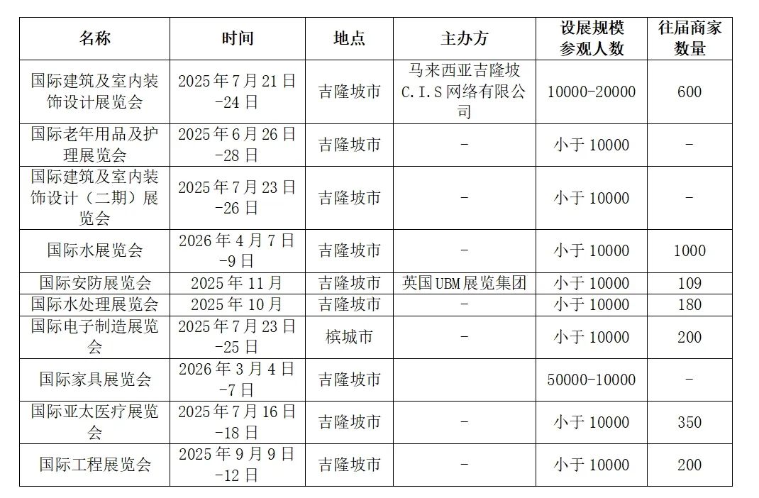 2025至2026年,马来西亚计划组织约50场展会,涉及行业包括建材/石材/照明/暖通(9场)、化工/环保/能源(4场)、珠宝/首饰/美容/眼镜(3场)、安防/劳保/公共工程(4场)、电子/电力/通讯/网络(5场)、家具/家电/家居(3场)。2025年第二季度,值得关注的展会有国际工业自动化、制造工艺及控制测量设备与技术展览会(IA-INDUSTRIAL AUTOMATION),将于2025年5月14日至17日在吉隆坡举办。