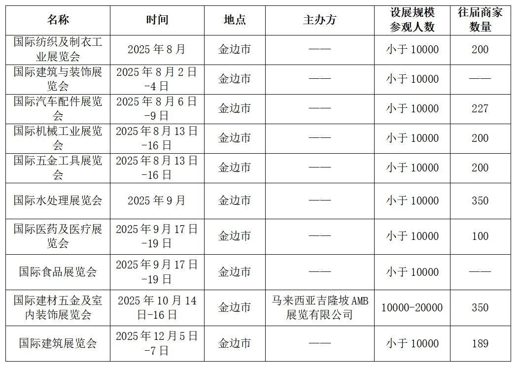 2025年,柬埔寨计划组织16场展会,涉及行业包括建材/石材/照明/暖通(3场)、机械/五金/工业(2场)、纺织/服饰/鞋革(1场)、化工/环保/能源(1场)、汽配/摩配/自行车(1场)、农/林/牧/渔(1场)、酒店/餐饮/旅游(1场)、生物/医疗/保健(1场)、食品/果蔬/饮料/酒(1场)。近期值得关注的展会有国际纺织及制衣工业展览会(CGT),将于2025年8月在金边举办;国际汽车配件展览会(CAMAUTO),将于2025年8月6日至9日在金边举办。