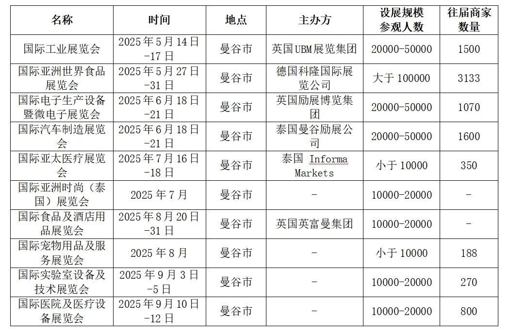 2025至2026年,泰国计划组织约116场展会,涉及行业包括机械/五金/工业(11场)、化工/环保/能源(11场)、食品/果蔬/饮料/酒(11场)、生物/医疗/保健(8场)、印刷/包装/纸业(8场)、建材/石材/照明/暖通(8场)。2025年第二季度,值得关注的展会有国际电子生产设备暨微电子展览会(NEPCON THAILAND),将于2025年6月18日至21日在曼谷举行。