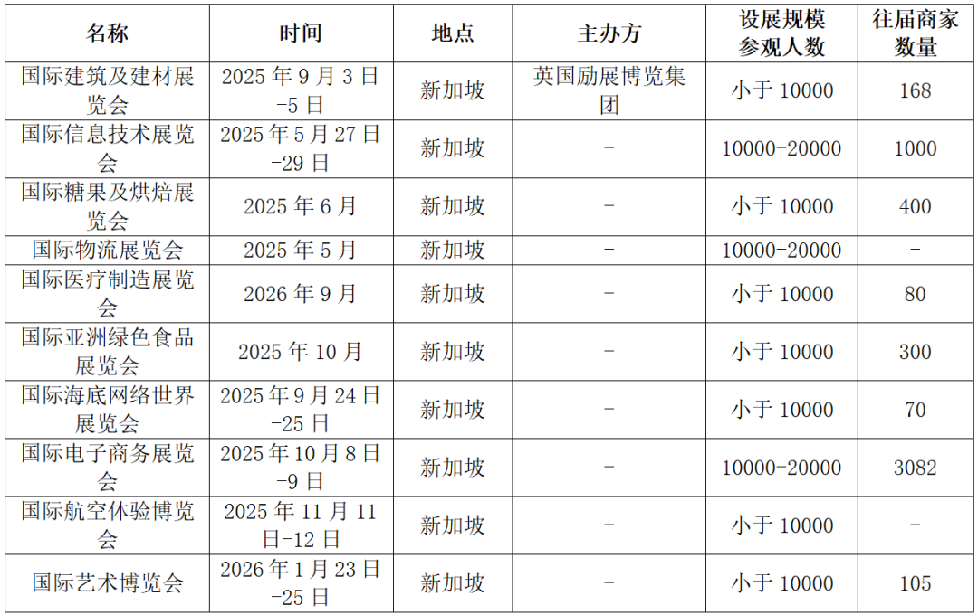 2025至2026年,新加坡计划组织约85场展会,涉及行业包括建材/石材/照明/暖通(4场)、计算机/软件/网络(10场)、生物/医疗/保健(5场)。2025年第二季度,值得关注的展会有国际物流展览会,将于2025年5月举办。
