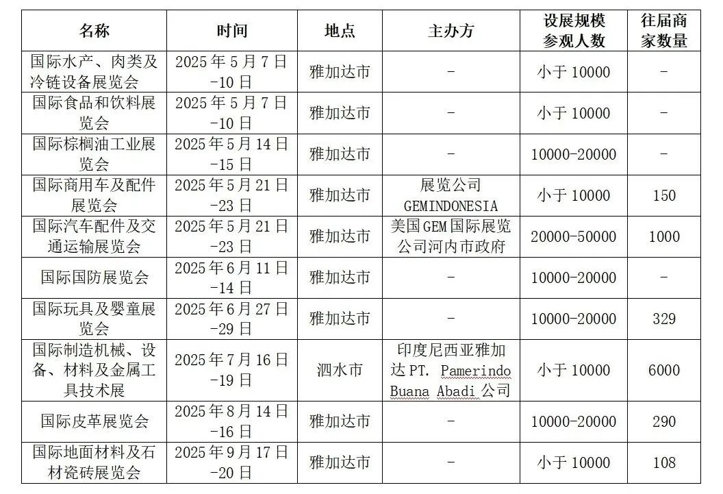 2025至2026年,印尼计划组织约117场展会,涉及行业包括建材/石材/照明/暖通(20场)、机械/五金/工业(14场)、汽配/摩配/自行车(12场)、化工/环保/能源(12场)、食品/果蔬/饮料/酒(8场)。2025年第二季度,值得关注的展会有国际棕榈油工业展览会(PALMEX INDONESIA),将于2025年5月14日至15日在雅加达市举办;国际汽车配件及交通运输展览会(THE INDONESIA INTERNATIONAL AUTO PARTS, ACCESSORIES & EQUIP EXHIBITION),将于2025年5月21日至23日在雅加达市举办。