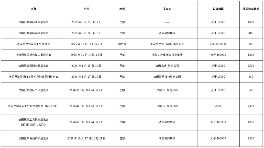 2025至2026年,法国计划组织超过300场各类展会,主要举办地在巴黎、图卢兹等地,涉及行业包括食品/果蔬/饮料/酒(36场)、建材/石材/照明/暖通(28场)、化工/环保/能源(28场)、计算机/软件/网络(25场)、酒店/餐饮/旅游(23场)。其中,影响力较大的包括法国巴黎国际面料展览会,将于2025年9月15日-17日在巴黎举办;法国巴黎国际零售展览会,将于2025年9月16日-18日在巴黎举办;法国图卢兹国际工业展览会,将于2025年10月14日-16日在图卢兹举办;法国巴黎国际工业配件展览会(MIDEST),将于2026年3月30日-4月2日在巴黎举办。