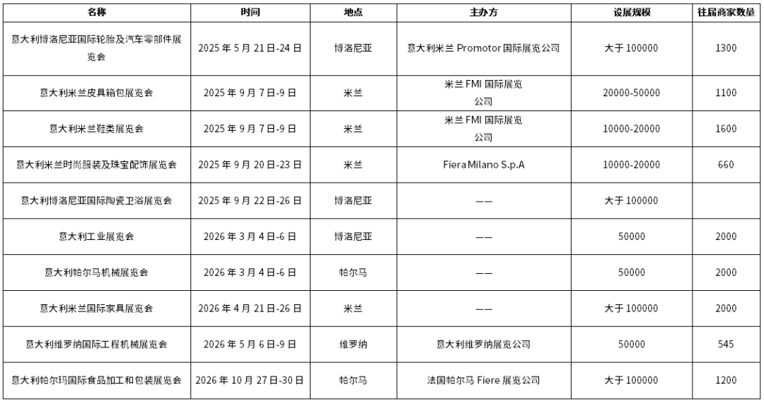 2025至2026年,意大利计划组织超过250场各类展会,主要举办地在米兰、博洛尼亚、帕尔马等地,涉及行业包括建材/石材/照明/暖通(30场)、纺织/服饰/鞋革(25场)、食品/果蔬/饮料/酒(24场)、化工/环保/能源(19场)、珠宝/首饰/美容/眼镜(17场)。其中,影响力较大的包括意大利米兰皮具箱包展览会及鞋类展览会,两场展会均将于2025年9月7日-9日在米兰举办;意大利工业展览会,将于2026年3月4日-6日在博洛尼亚举办;意大利米兰国际家具展览会,将于2026年4月21日-26日在米兰举办。