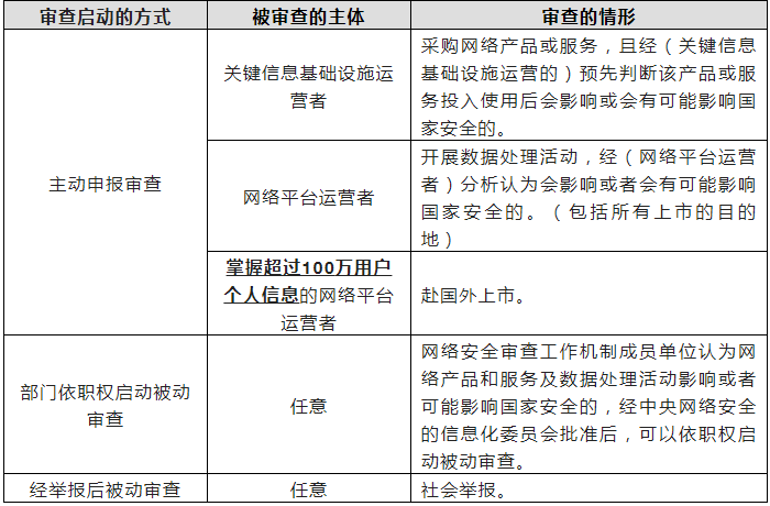《审查办法》在2021年的修订中,又进一步扩大了公司赴海外上市的网络安全审查的覆盖范围。对于网络安全审查工作机制成员单位认为影响或者可能影响国家安全的网络产品和服务以及数据处理活动,主管部门有权依法依职权开展网络安全审查,为审查方式的一种,也被成为“被动审查”。除此之外,网络安全审查还包括“主动申报审查”,即依照《审查办法》中的规定,触发主动申报审查的情形,公司需要在此情形下履行主动申报审查义务。修订后的《审查办法》将原有的主动申报审查又拓展了一种情形,也是与企业赴海外上市最相关的情形。由此根据修订后的《审查办法》主动申报审查的情形增加到了3种,被动审查情形为2种,详见下表:
