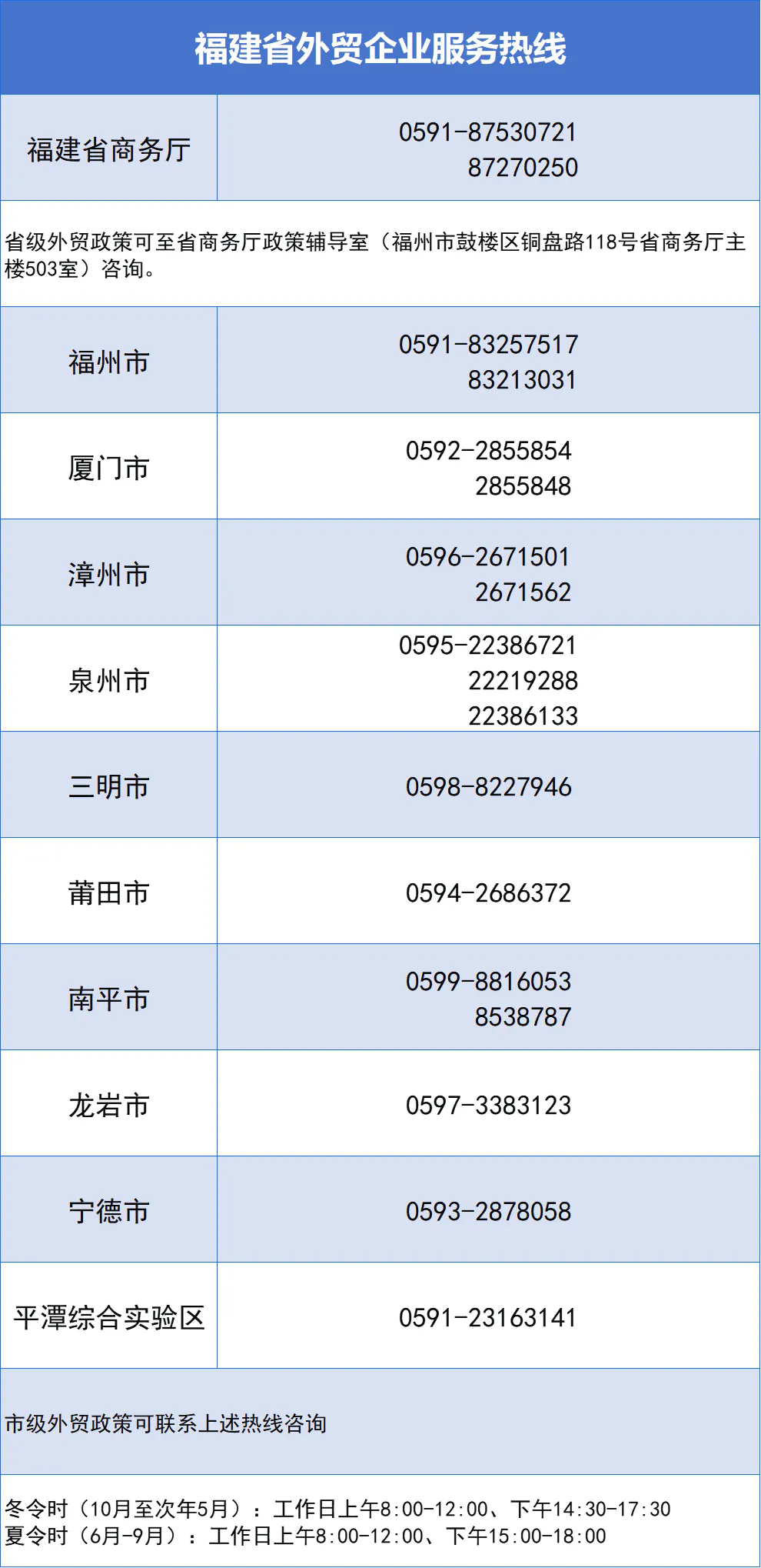 为进一步加强外贸企业服务,即日起,河马剧场 联动地市商务部门设立“外贸企业服务热线”,外贸企业可以通过热线获得政策咨询、业务指导、诉求反映等服务。现将福建省外贸企业服务热线公布如下:
