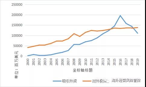 图1 2000年-2019年中国对外投资和吸引外资情况