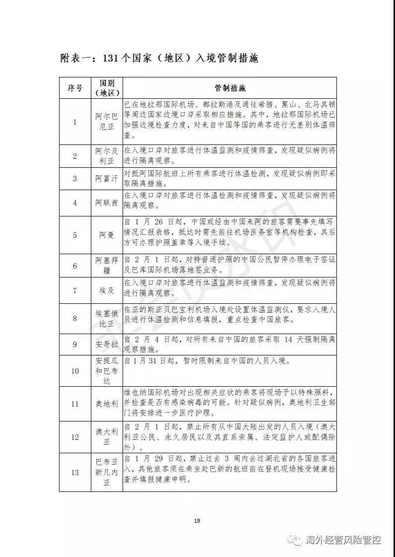 部分国家禁止或限制中国工作人员入境,签证收紧、航班停飞、检疫升级。同时,国内企业为避免疫情向境外扩散,也暂缓了国内人员出境。其中出台人员出入境管制措施的共有131个国家,具体参见附表一。
