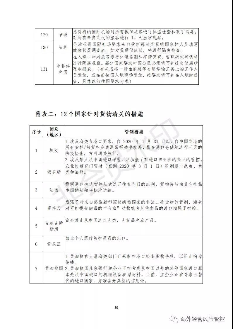 部分国家对来自中国的物资加强检疫,入境港口要求暂停、延期或拒绝入港等措施,导致物资延迟入关。而国内工厂由于疫情发生,暂缓复工,国内生产的建筑材料、生产物资等出口也将会受到延误。目前,共有12个国家实施了货物清关措施,具体见附表二。