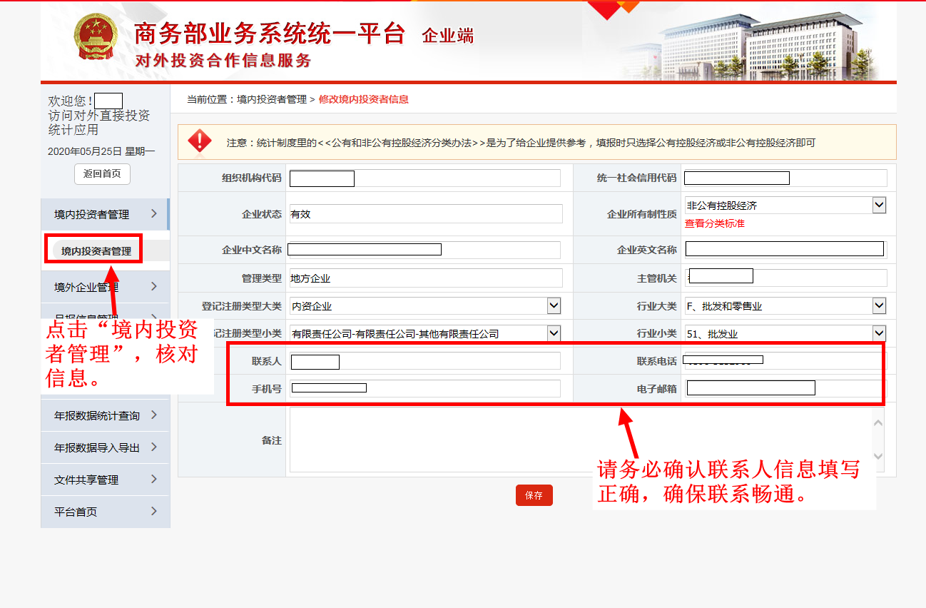 (2)如系统未弹窗提示,也请先点击“境内投资者管理”,核对境内企业信息,特别是联系人信息,如联系人已离职或非本企业员工,请及时更新联系人。