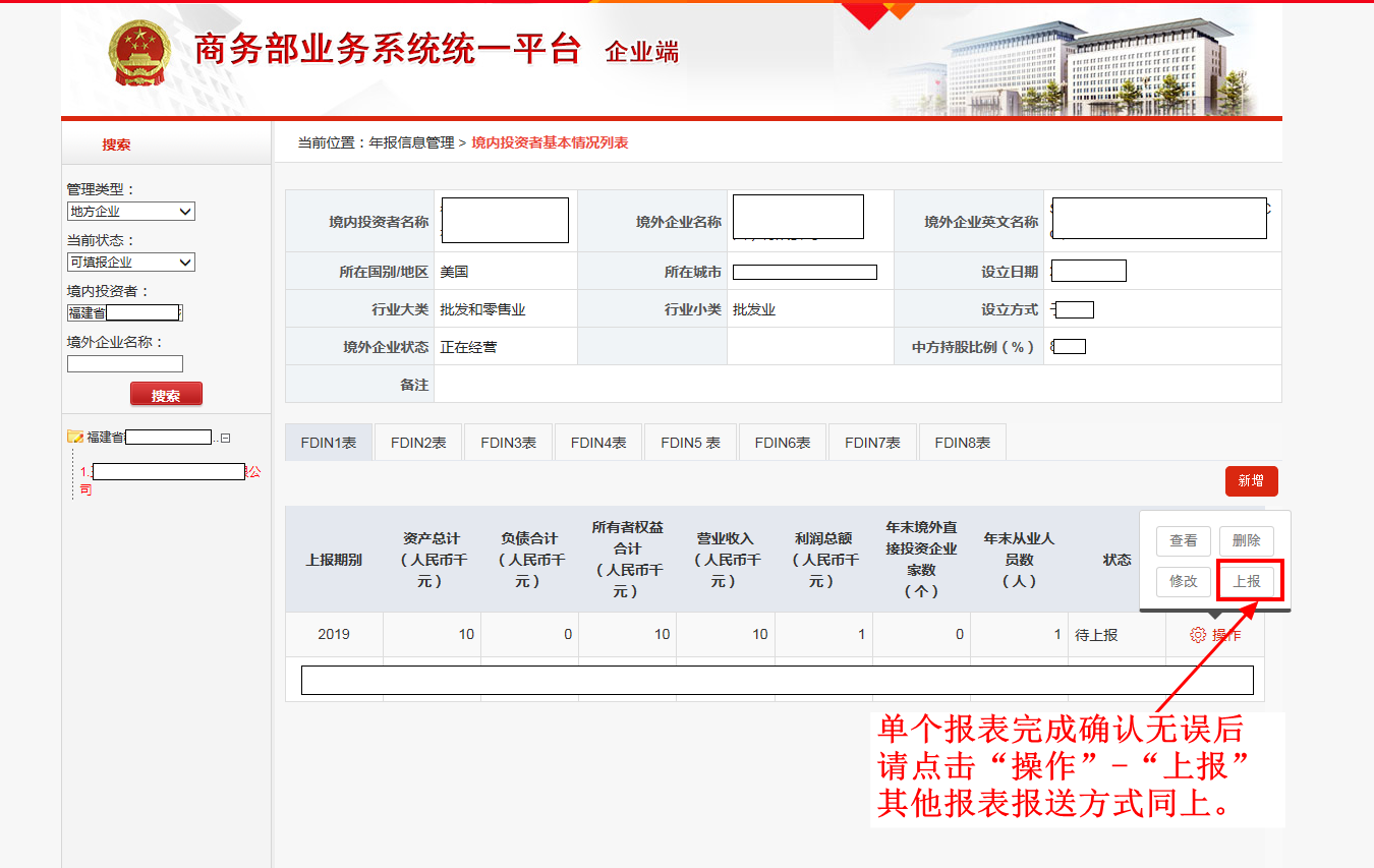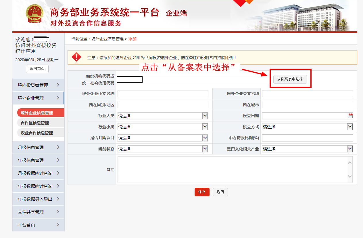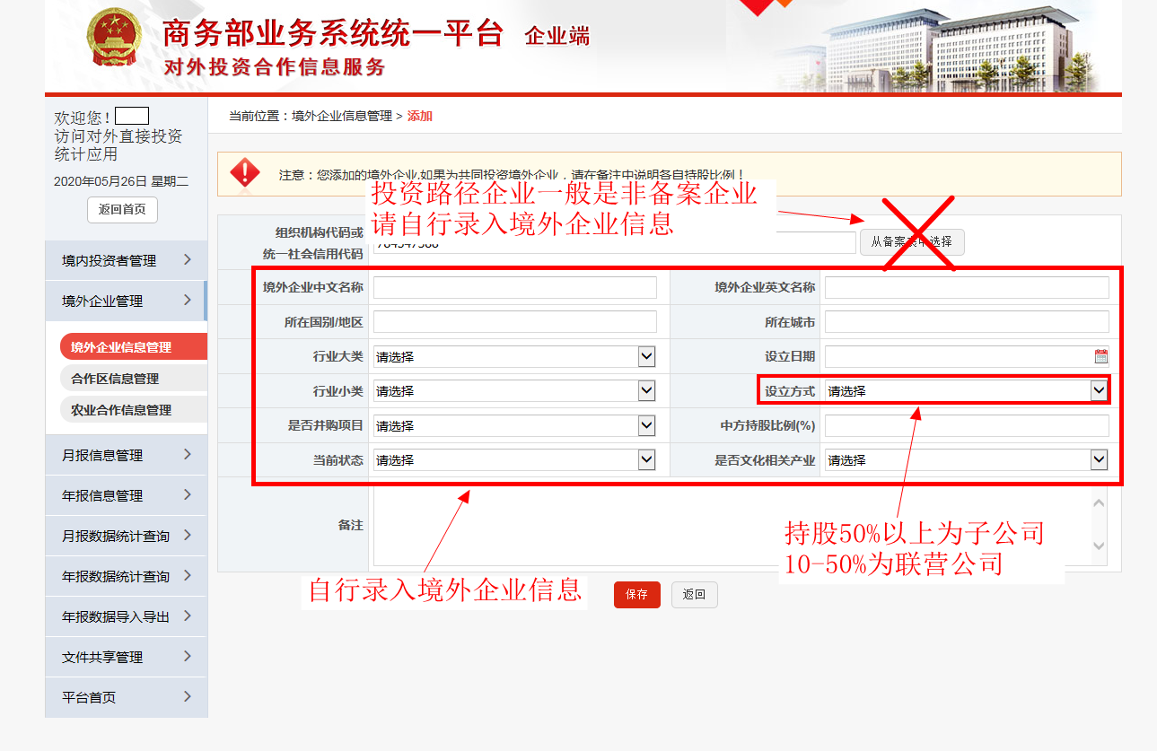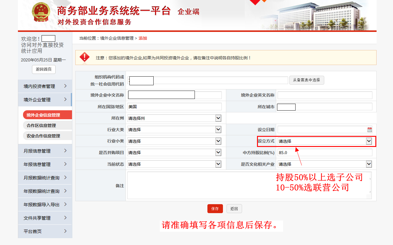 在正式填报数据前,请先核对完善境内主体信息和境外企业信息