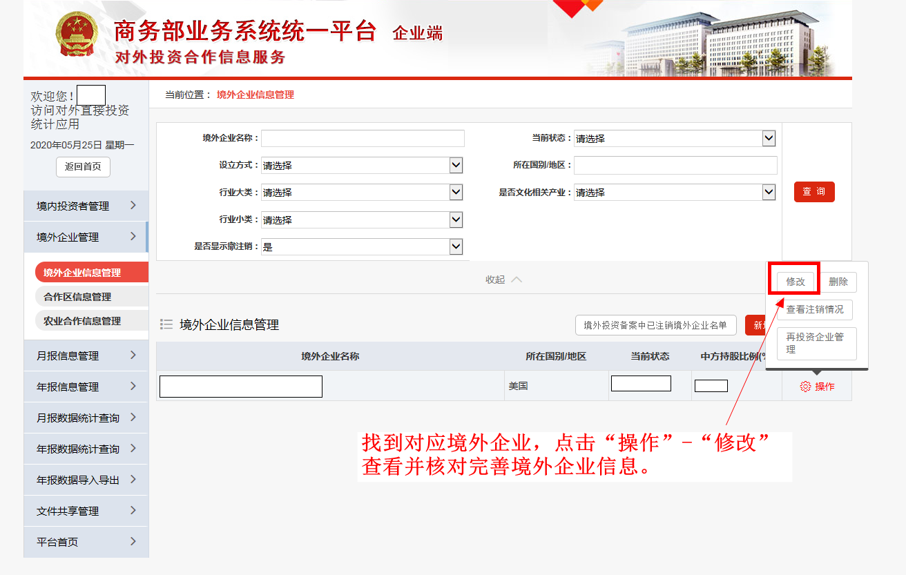 如果境外企业齐全,请点击“操作”-“修改”,查看并核对境外企业信息。