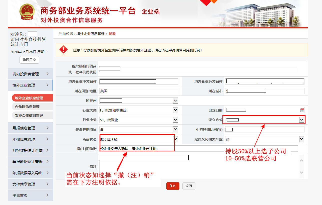 答:填报相应的负流量,将期末存量调整为0,然后将该境外企业的状态调整为撤(注)销。