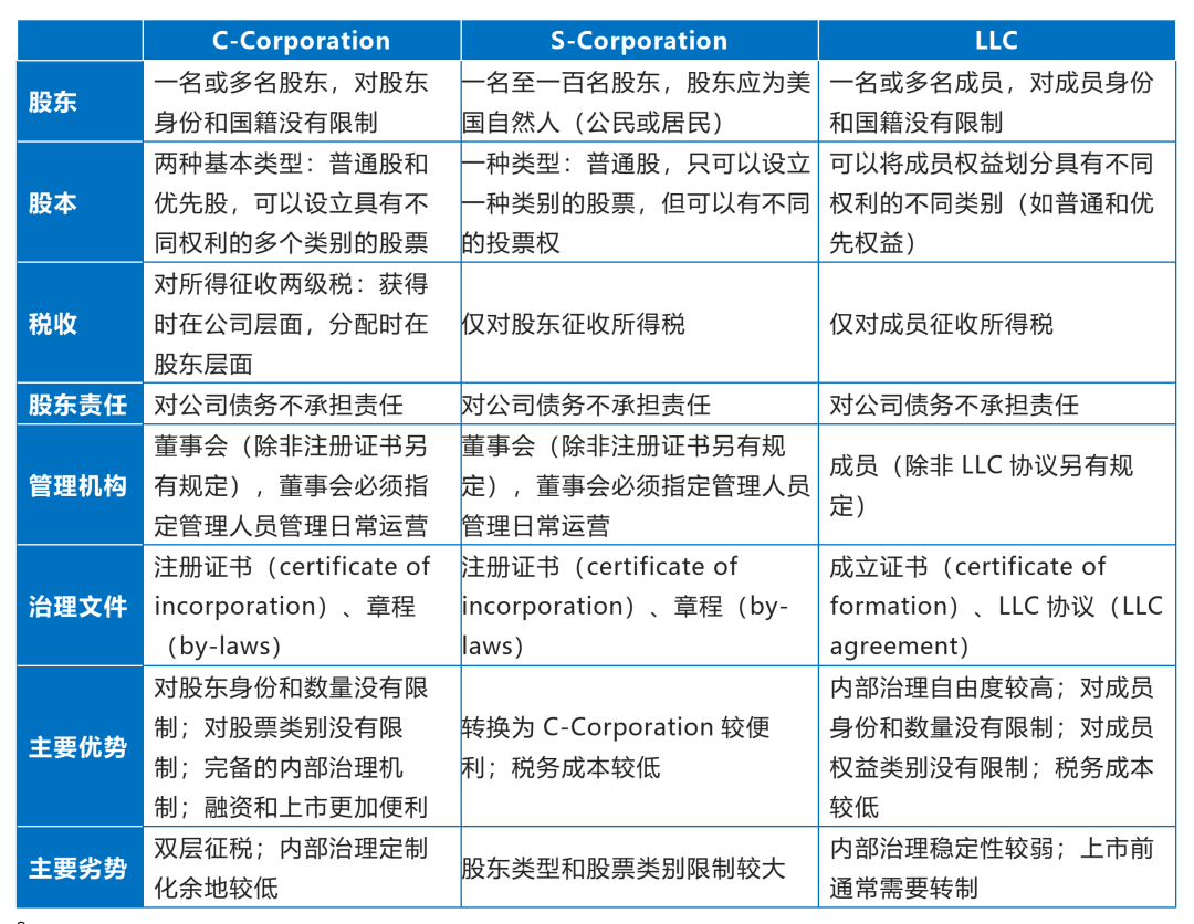 近年来,越来越多的中国企业将其业务拓展至美国市场。对于计划进军美国市场的中国企业而言,往往会选择在美国设立实体实现本地化运营,从而更好地服务当地客户、更便利地在当地开展业务以及从法律架构上隔离风险。结合我们近年来服务中国企业出海美国的经验和当地法律和实践的要求,我们将中国企业在美国设立实体的一些主要考量因素和要求简要介绍如下。(一)设立地的选择 – DE or CA ?与中国不一样的是,美国一般不要求企业必须设立在其主要营业地所在的州。因此,企业可以结合各个州的监管环境、税费要求、经济水平、劳动力资源等各个因素综合考量和选择最合适的设立地。实践中,特拉华州(Delaware)和加利福尼亚州(California)是大部分中国企业选择的美国实体设立地。我们将这两个州各自的主要优势和选择它们的主要考量因素简要总结如下。1、特拉华州相比于其他州而言,特拉华州的主要优势是稳定高效的公司法律体系以及具有吸引力的税收优惠政策,因此非常适合作为企业的控股、融资和上市主体的注册地。虽然是第二小的州,特拉华州却是美国最受欢迎的公司设立地。超过50%的美国上市公司,超过60%的财富500强公司都选择在特拉华州设立。中国企业出海美国也大部分选择特拉华州作为美国实体的设立地。(1) 特拉华州的法律体系优势包括[4]:成文的公司法,具有可预见性和稳定性;公司法的强制性规定很少,为股东和管理者管理公司内部事务提供了更大的灵活性;高效和商业友好的争议解决程序等。(2) 特拉华州的税收优惠政策包括[5]:不需要缴纳各类间接税(如消费税)和财产税;在特拉华州注册但业务经营不在特拉华州的公司(如控股实体),符合条件的,不需要缴纳公司所得税;在一定条件下,增雇员工或增加投资可以享受所得税减免的优惠待遇;投资于政府鼓励发展的行业可在十年内享受营业收入税减免的优惠等。2、加利福尼亚州相比特拉华州,加州因其独特的优势更适合创业者以及互联网、科技和金融等行业的企业作为开展业务的主要营业地。加州,特别是硅谷,是美国的创业天堂,众多互联网和科技公司均将总部设在加州,比如苹果、谷歌、英特尔、惠普、思科、甲骨文、特斯拉、SpaceX、奈飞等。加州独特的优势包括:汇聚众多VC/PE基金、金融机构以及创业企业,因而具备得天独厚的科技创新环境以及创业和融资环境;是美国经济最发达和人口最多的州之一(加州也是美国华人最集中的州),因而具有充足的劳动力和人才资源;公路、铁路、海运、空运都十分发达,适合发展进出口贸易和跨境电商。加州在资本、技术和人才上的优势,以及活跃的创业和投资环境,能够为企业提供更多的融资机会和研发支持。(二)实体形式的选择 – C-Corporation、S-Corporation or LLC ?中国企业在美国设立实体的主要形式是公司,除了公司还有合伙等形式。美国公司较常见的形式包括C-Corporation、S-Corporation和Limited Liability Company(LLC)。其中C-Corporation因其更加完备的内部治理机制、灵活的股票类别安排以及融资和上市的便利性,是大多数中国企业在美国设立实体的选择。相比较而言,S-Corporation的限制较大,股东需要为美国自然人,且只能够发行普通股一种股票。LLC则更适合股东构成以及股东权利义务安排较简单的小型企业。以特拉华州为例,我们将这几种形式的基本要求和优劣势对比总结如下:
