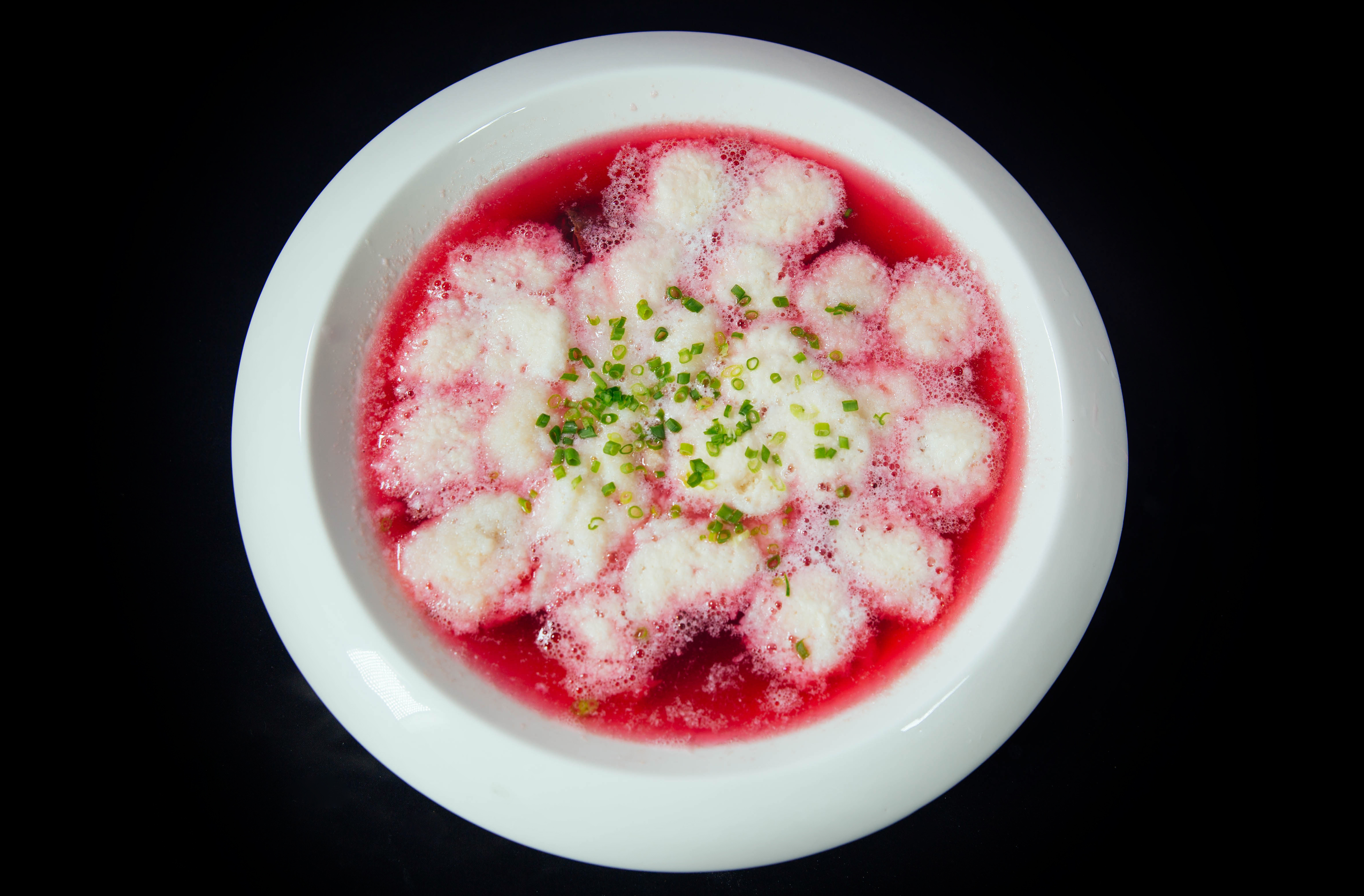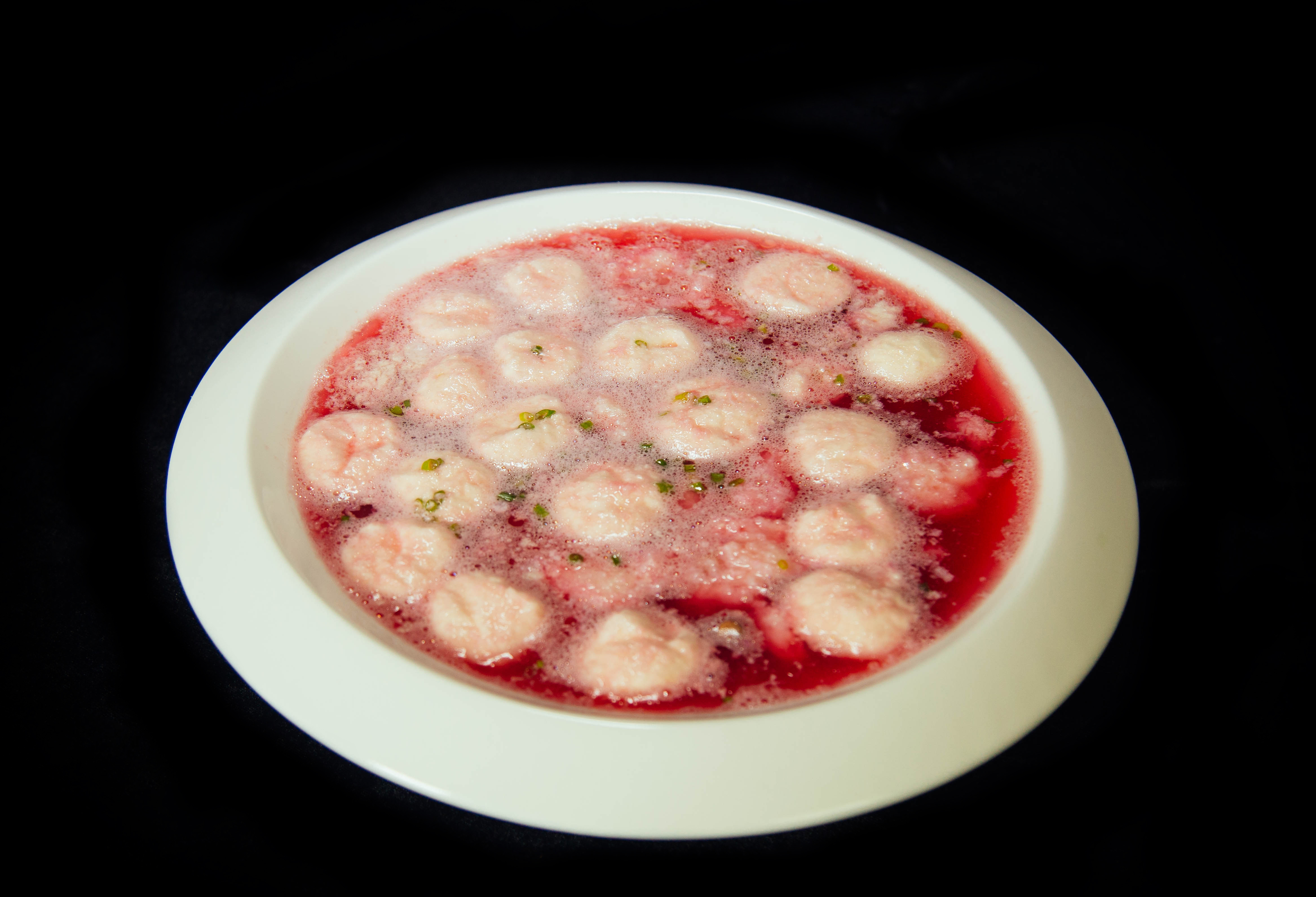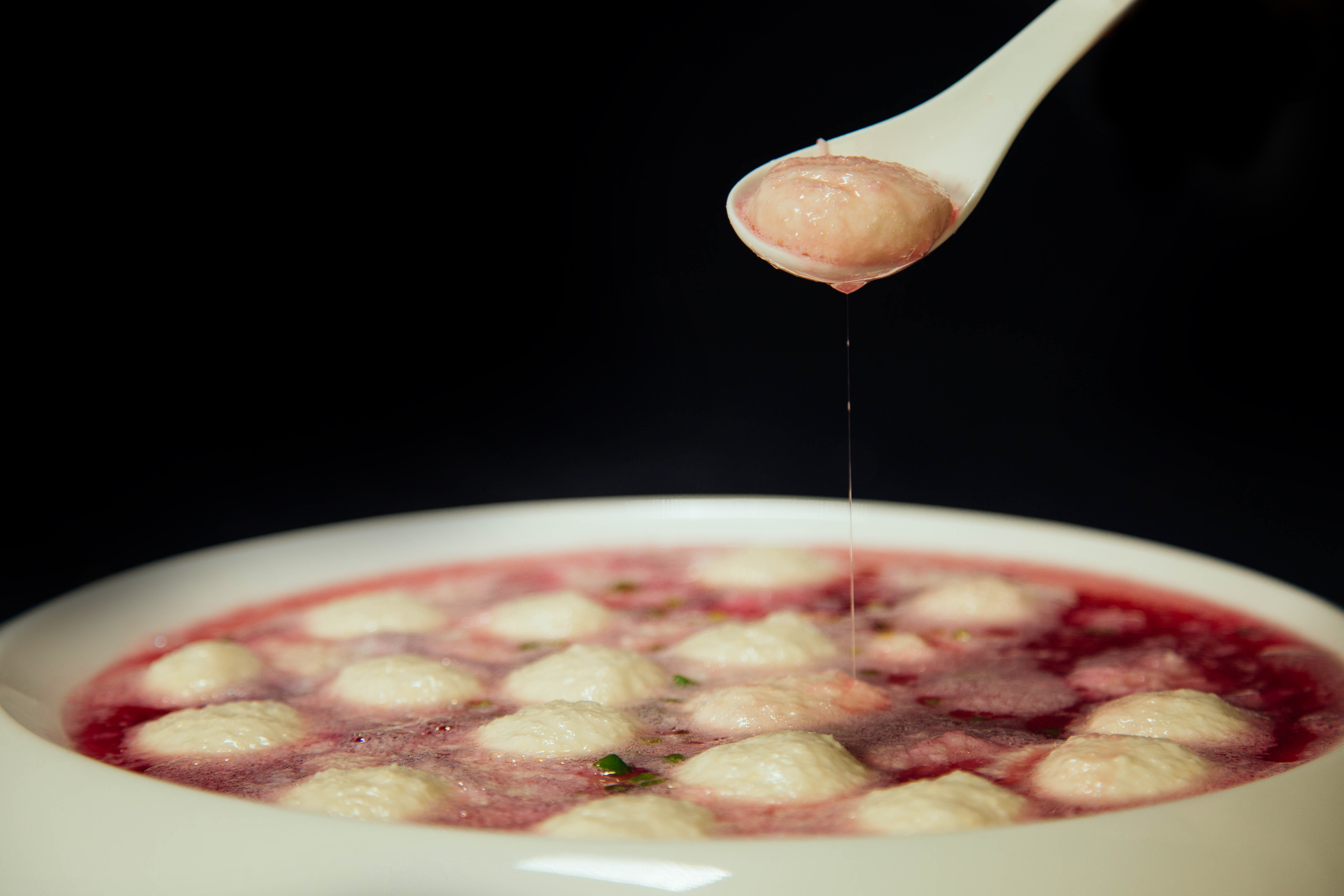 4.淮山泥加糯米粉朝一个方向搅打上劲,包入馅料,挤成丸子,入温水锅中氽熟。红菇加高汤、调料煮熟,放入氽熟的淮山丸,上桌前撒上葱花即可。
