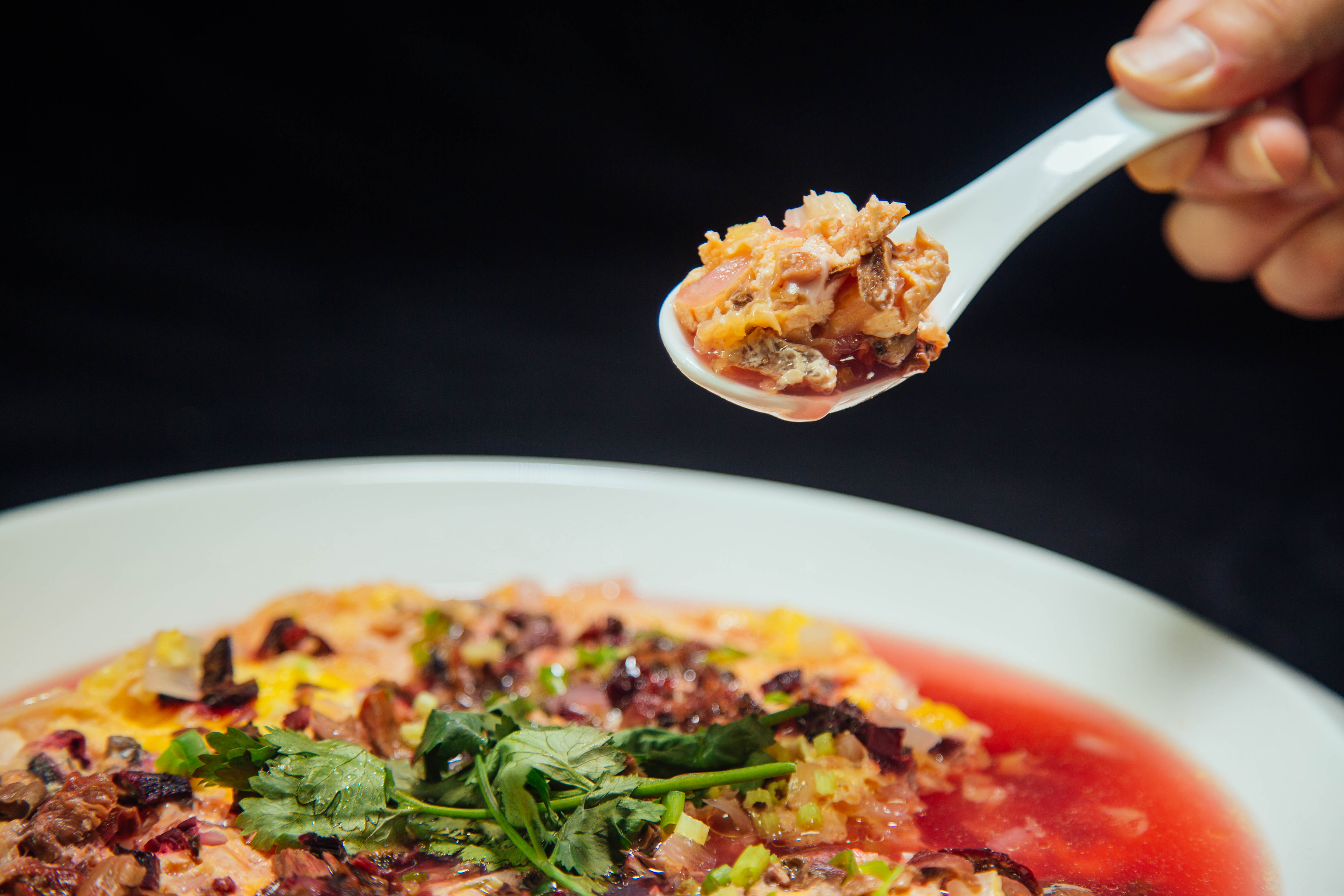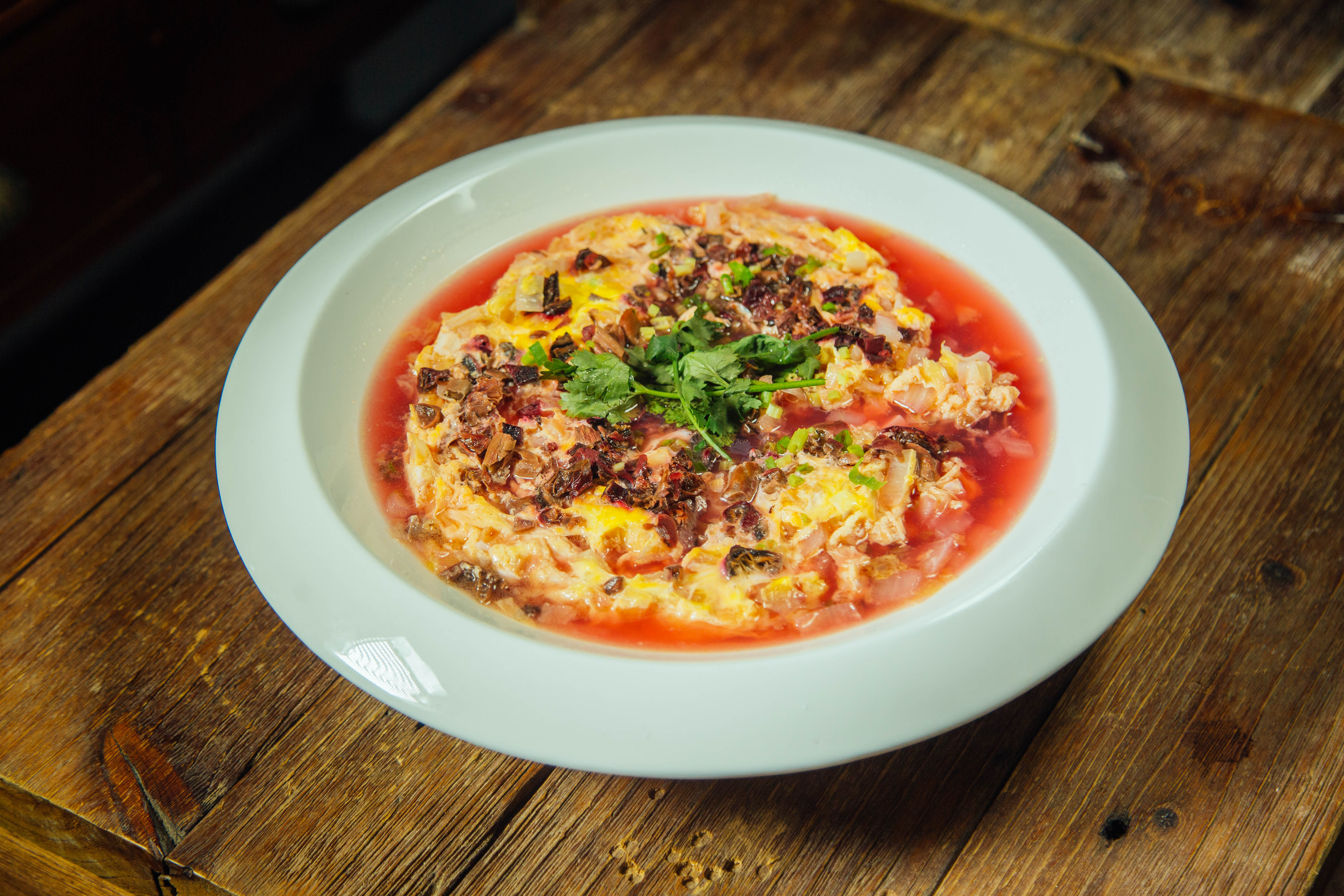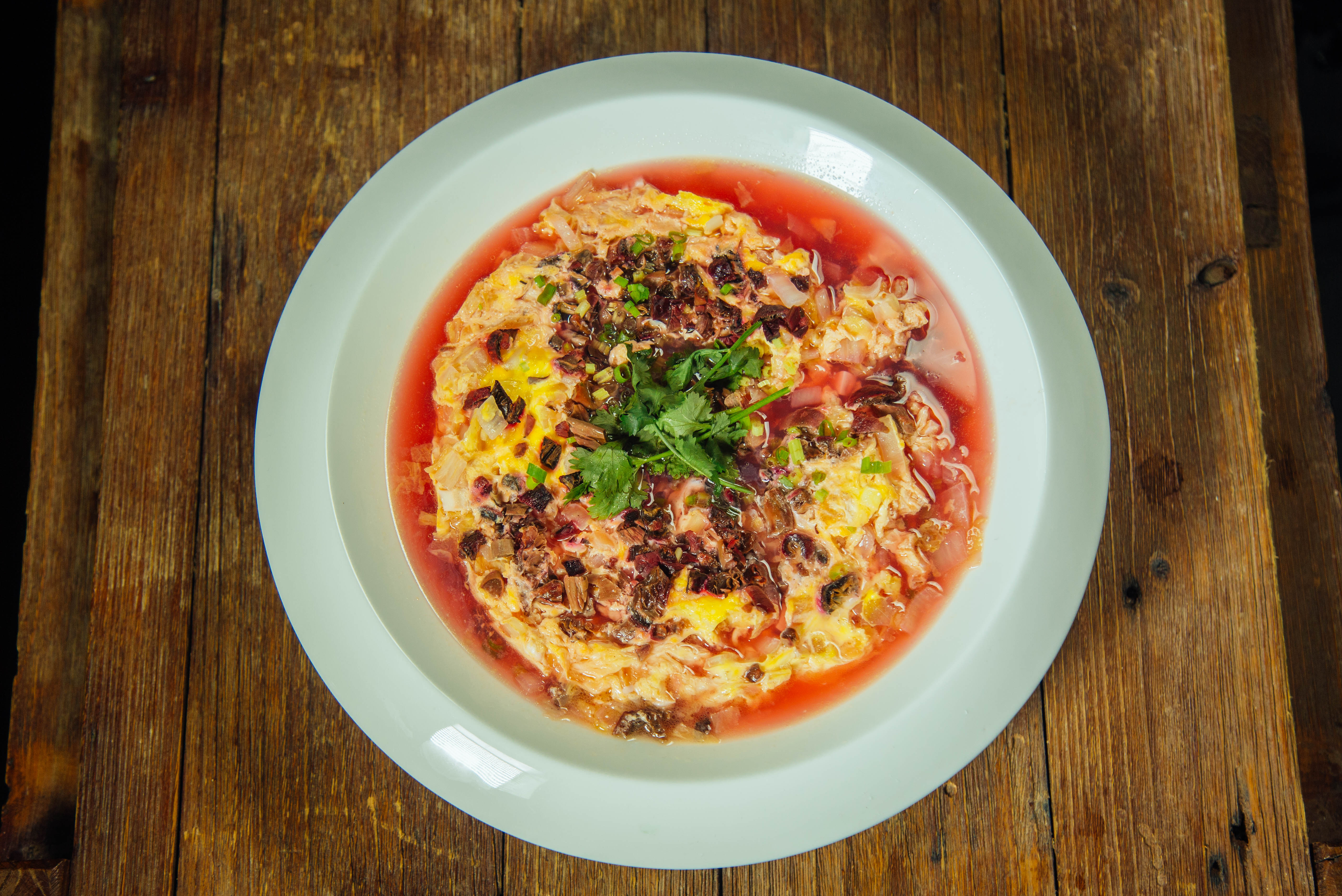 【菜肴食材】鸡蛋8个、高汤800克、红菇50克、虾仁干30克、大白菜200克、瘦肉80克、白豆腐100克,葱、芹菜、香菜少许,盐巴5克、鸡精4克、味精4克。