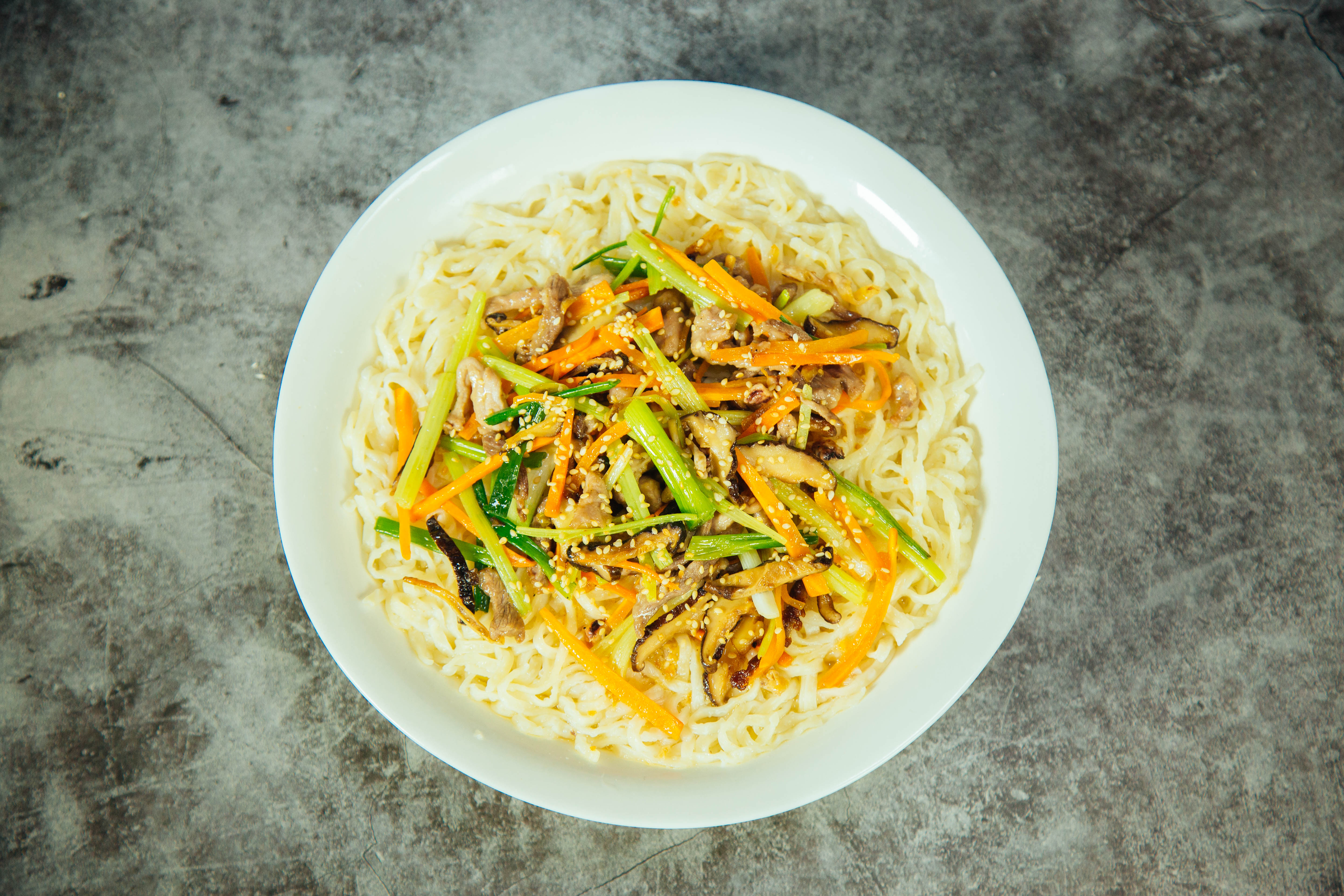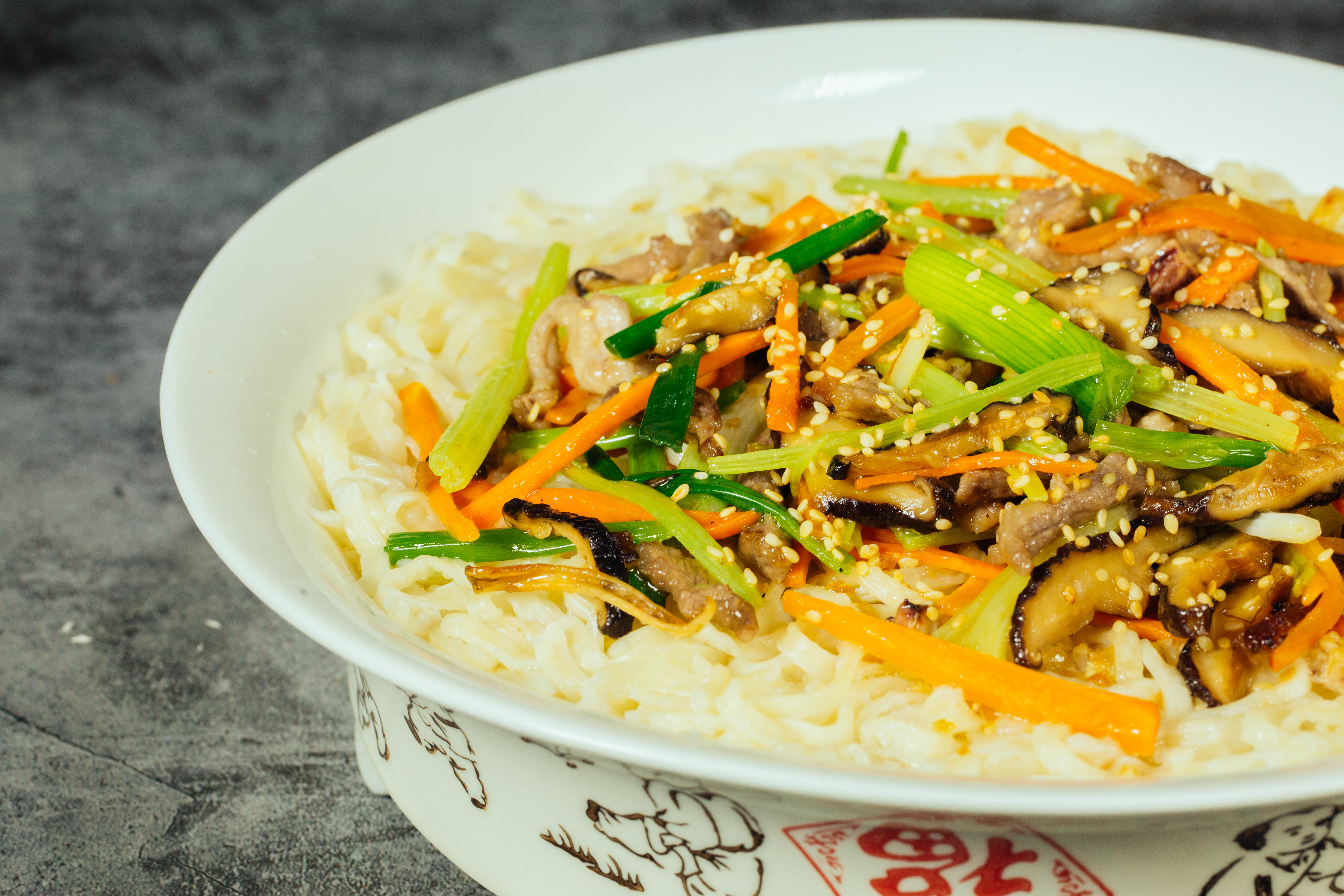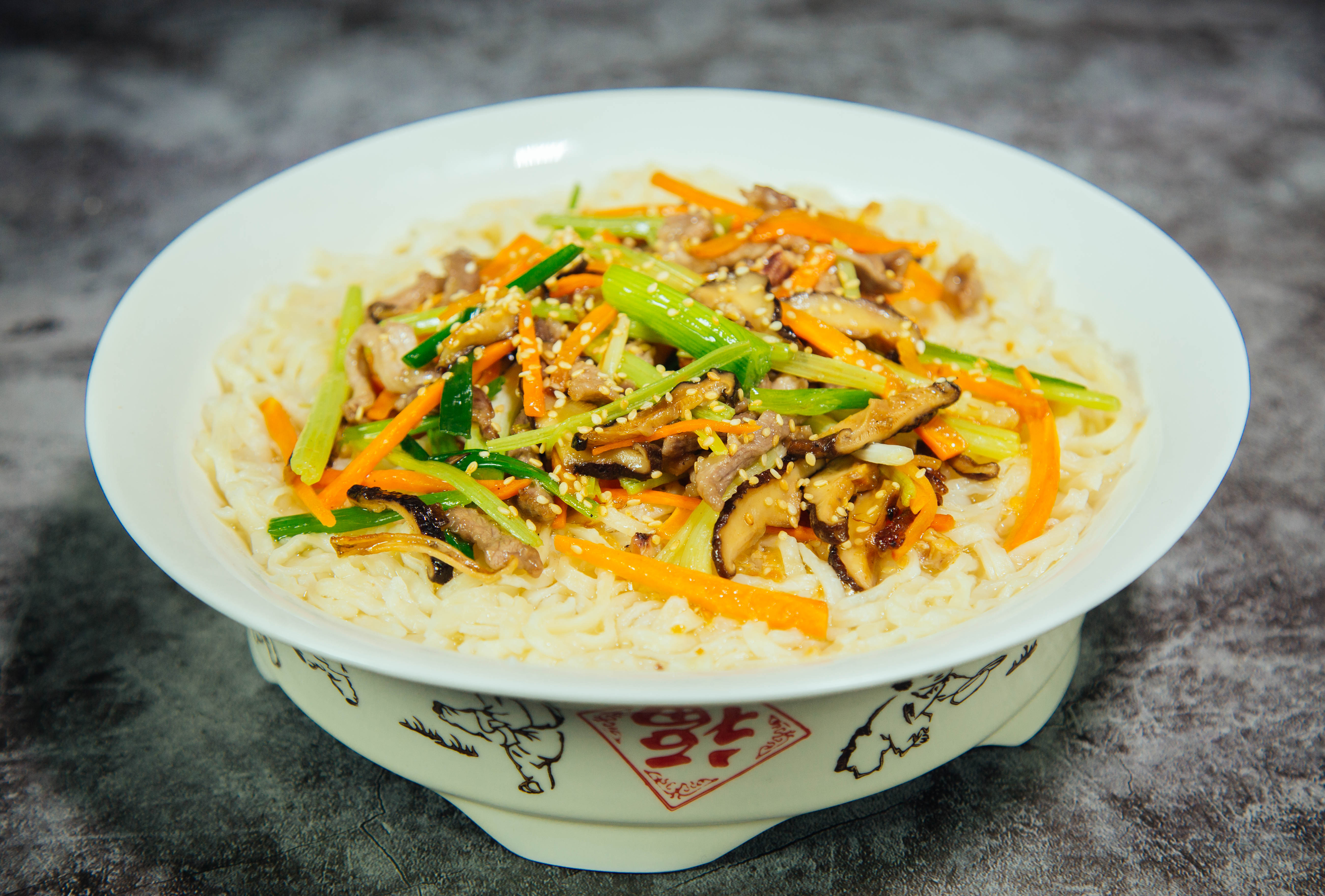 【菜肴食材】湿面300克、高汤600克、猪瘦肉60克、香菇20克、胡萝卜30克、葱5克、鱿鱼干30克、精盐8克、料酒20克、葱30克、姜8克、蒜5克、香油15克、地瓜粉15克、熟芝麻5克。