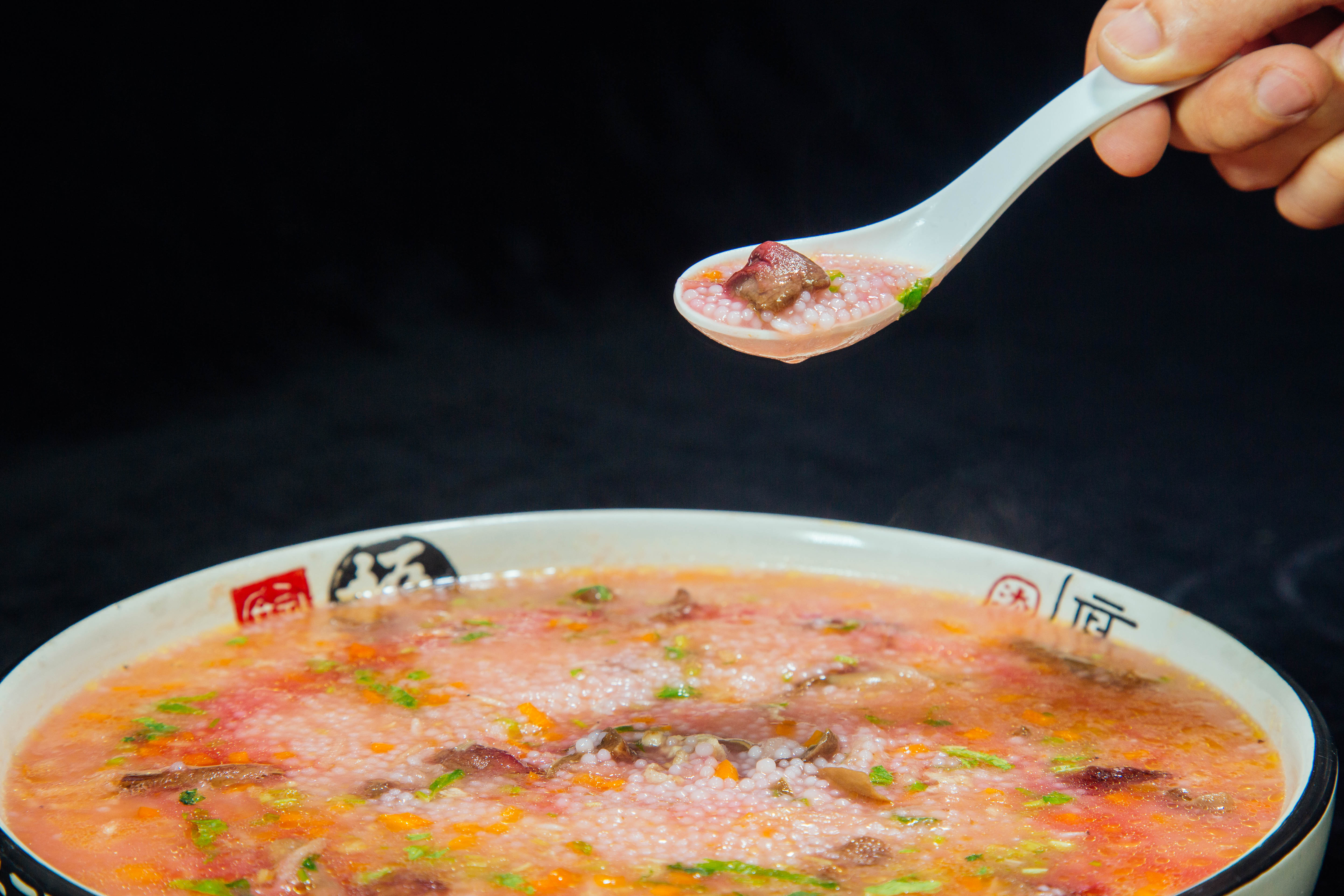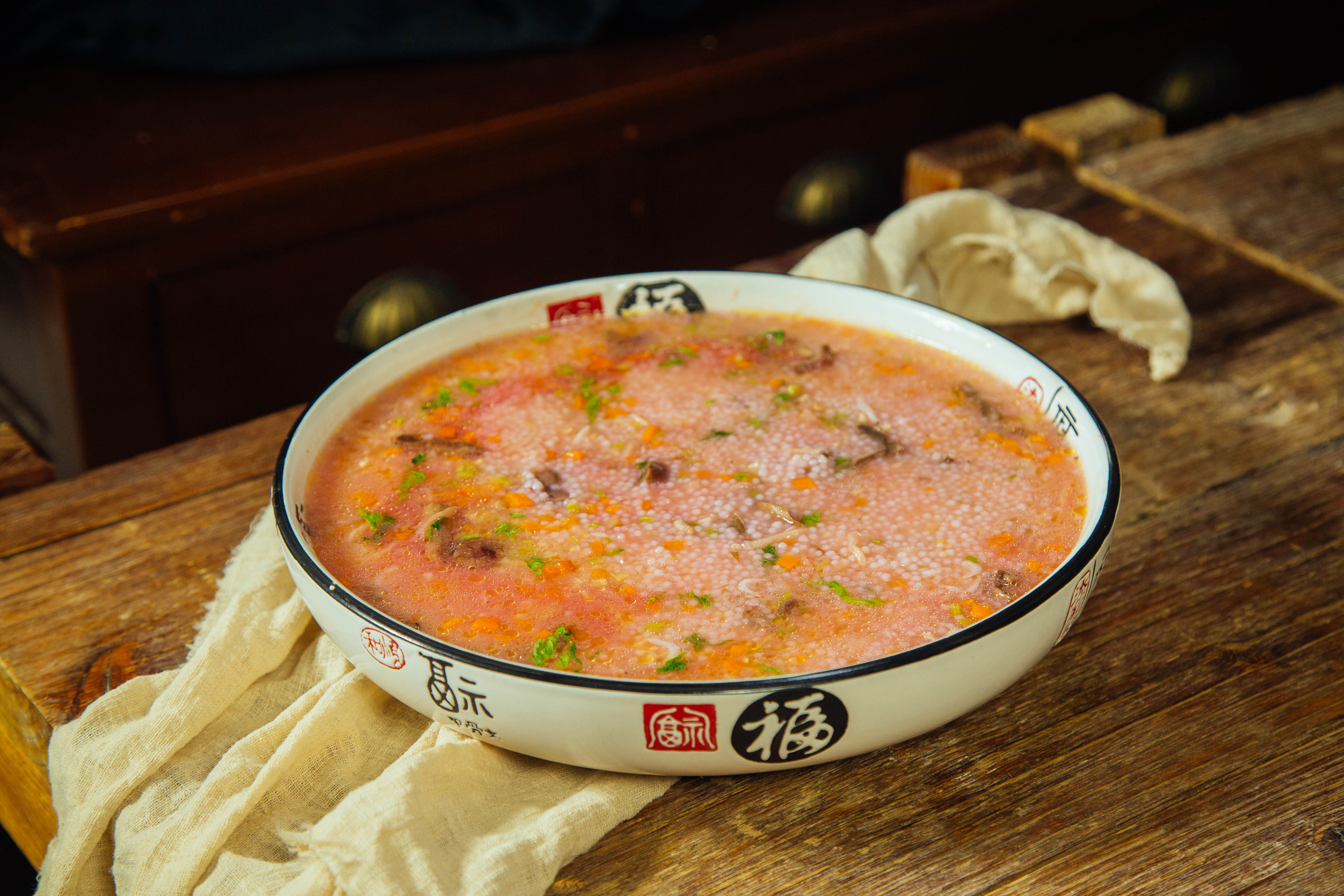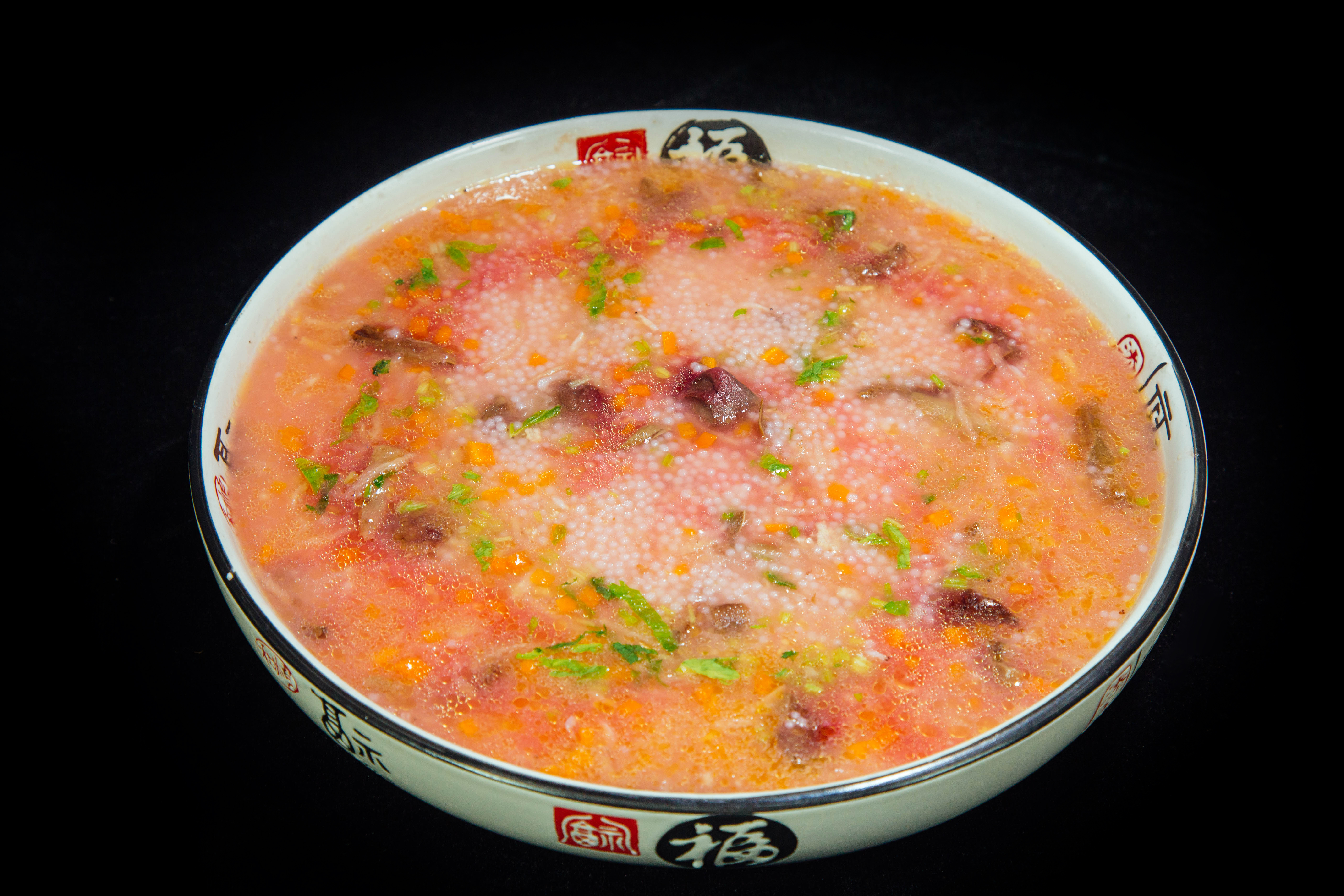2.锅烧热,下猪油将肉末、虾皮、红菇、萝卜丝干、胡萝卜丁炒香,加入高汤和泡透的珍珠粉,煮十分钟调味,加入芹菜末装盘,跟红酒一小碗上桌即可。