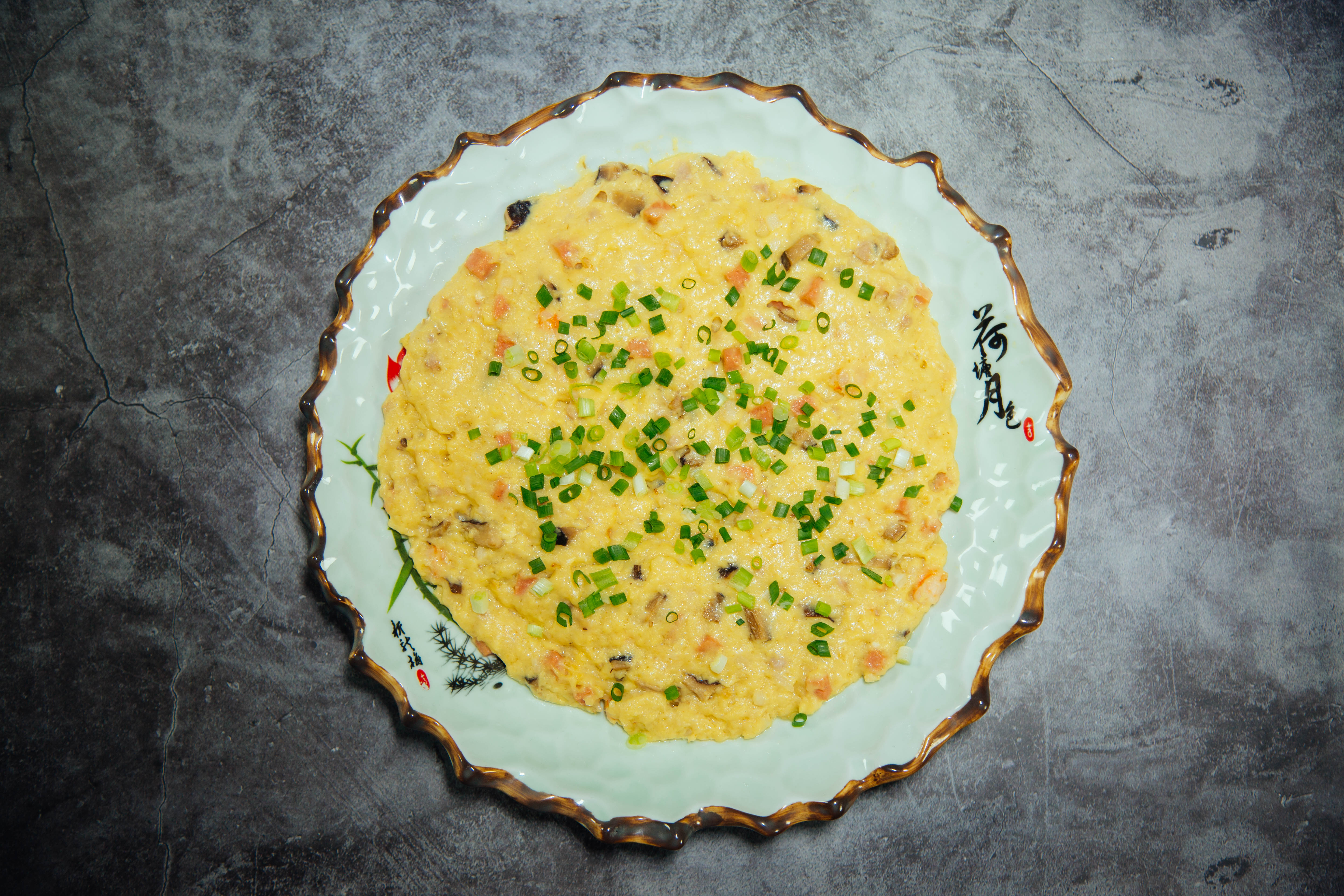 2.将冬菇、火腿、虾仁、瘦肉、冬笋均切细粒,干贝撕成丝,然后下锅炒熟,和高汤一起倒入蛋碗中,加入精盐、料酒、胡椒粉、地瓜粉、高汤,调和均匀待用。