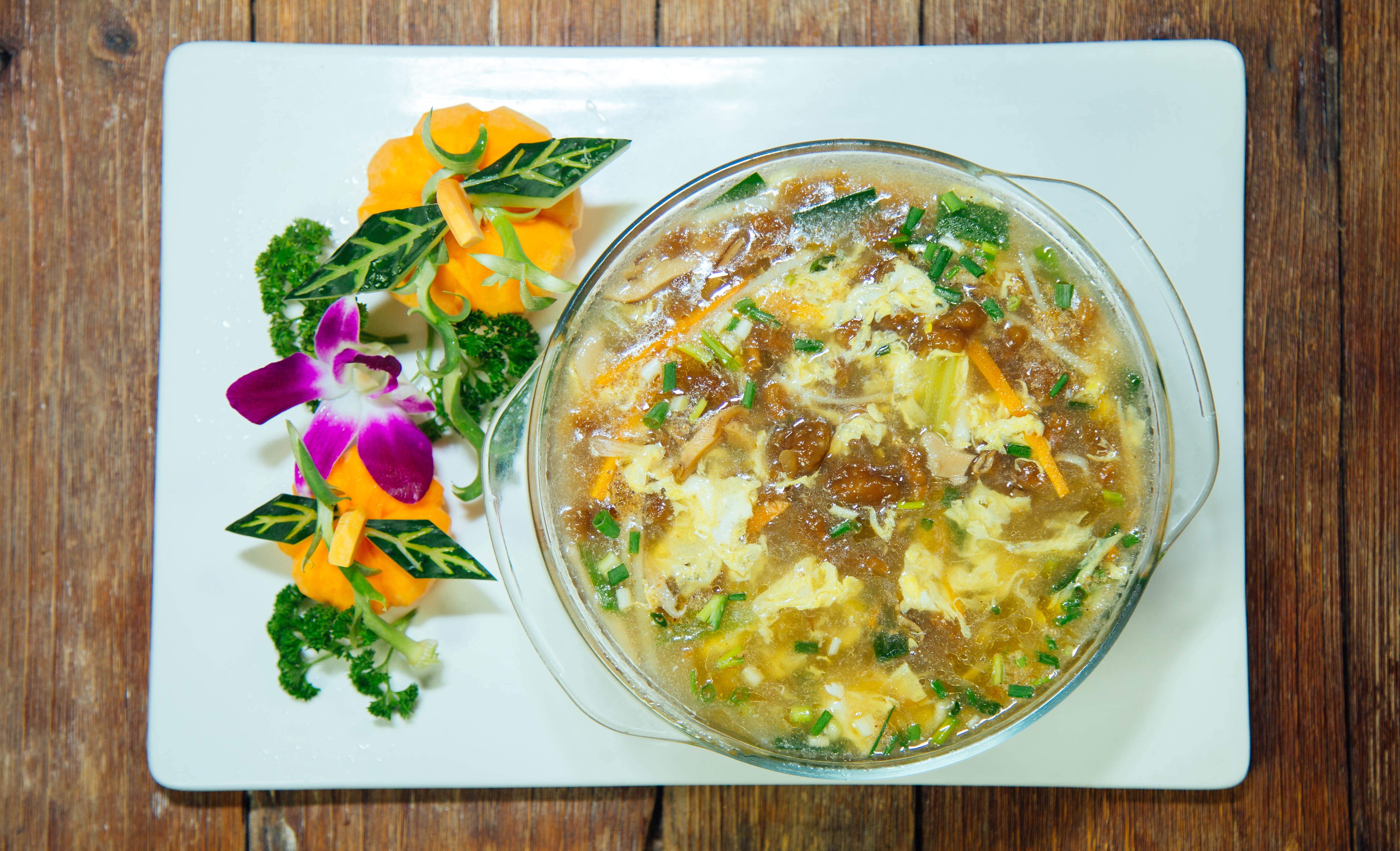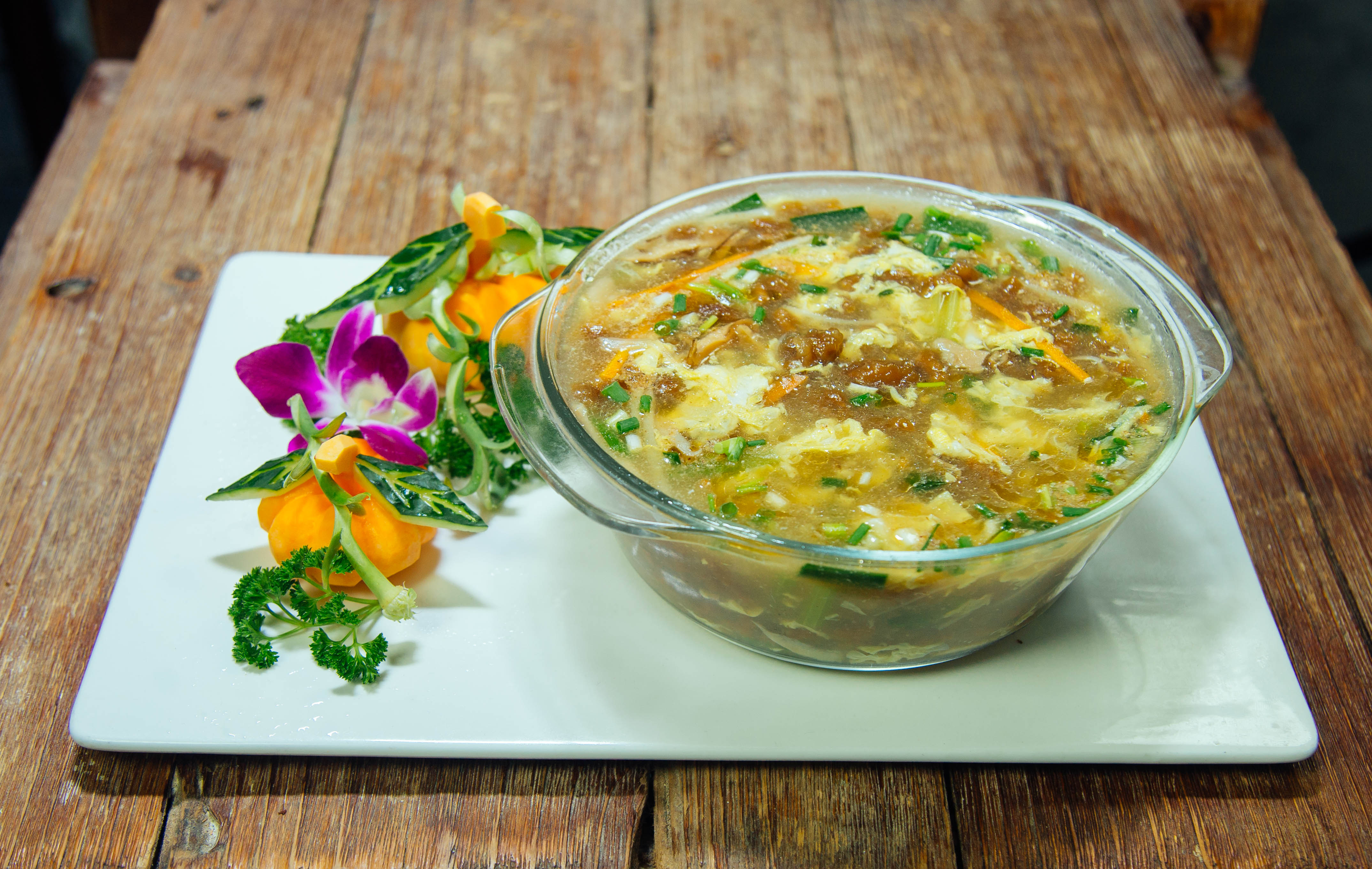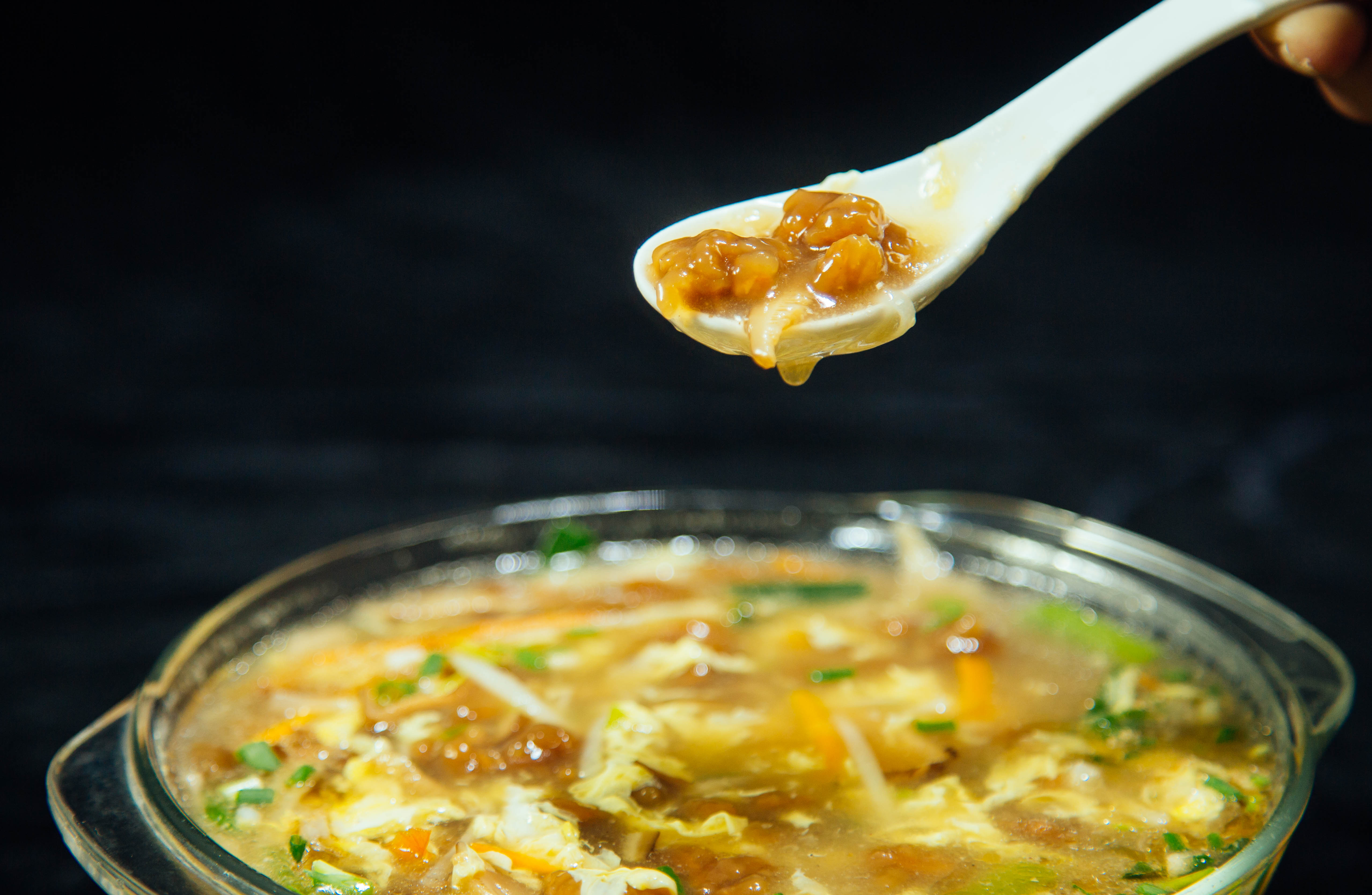 3.锅上中火,加入高汤、盐、肉丁、笋丝、香菇丝、胡萝卜丝后,用地瓜粉勾薄芡,倒入蛋液搅匀,装入碗中,再放胡椒粉、麻油、红酒、葱花。装碗后撒少许油渣末尤妙。