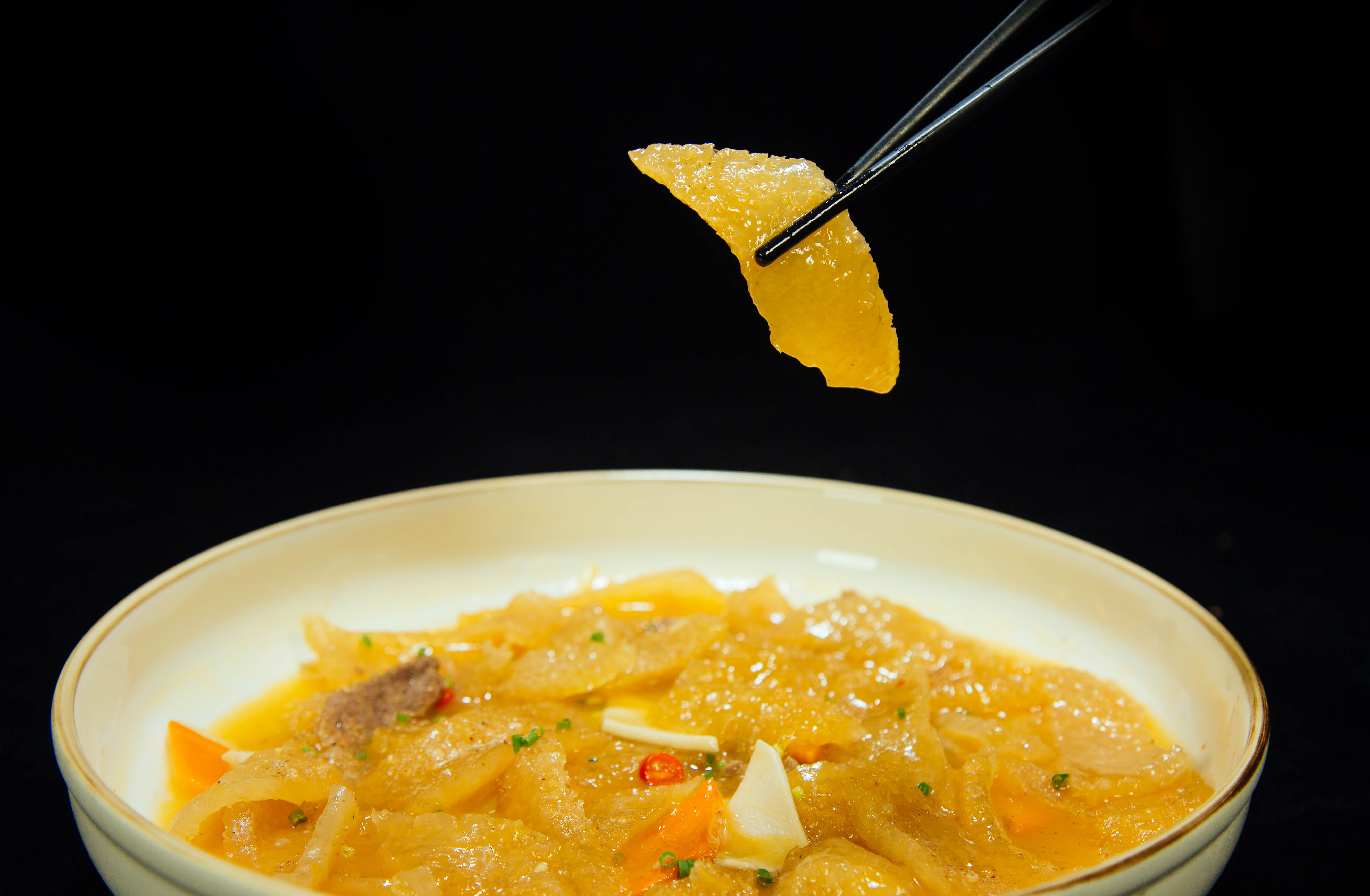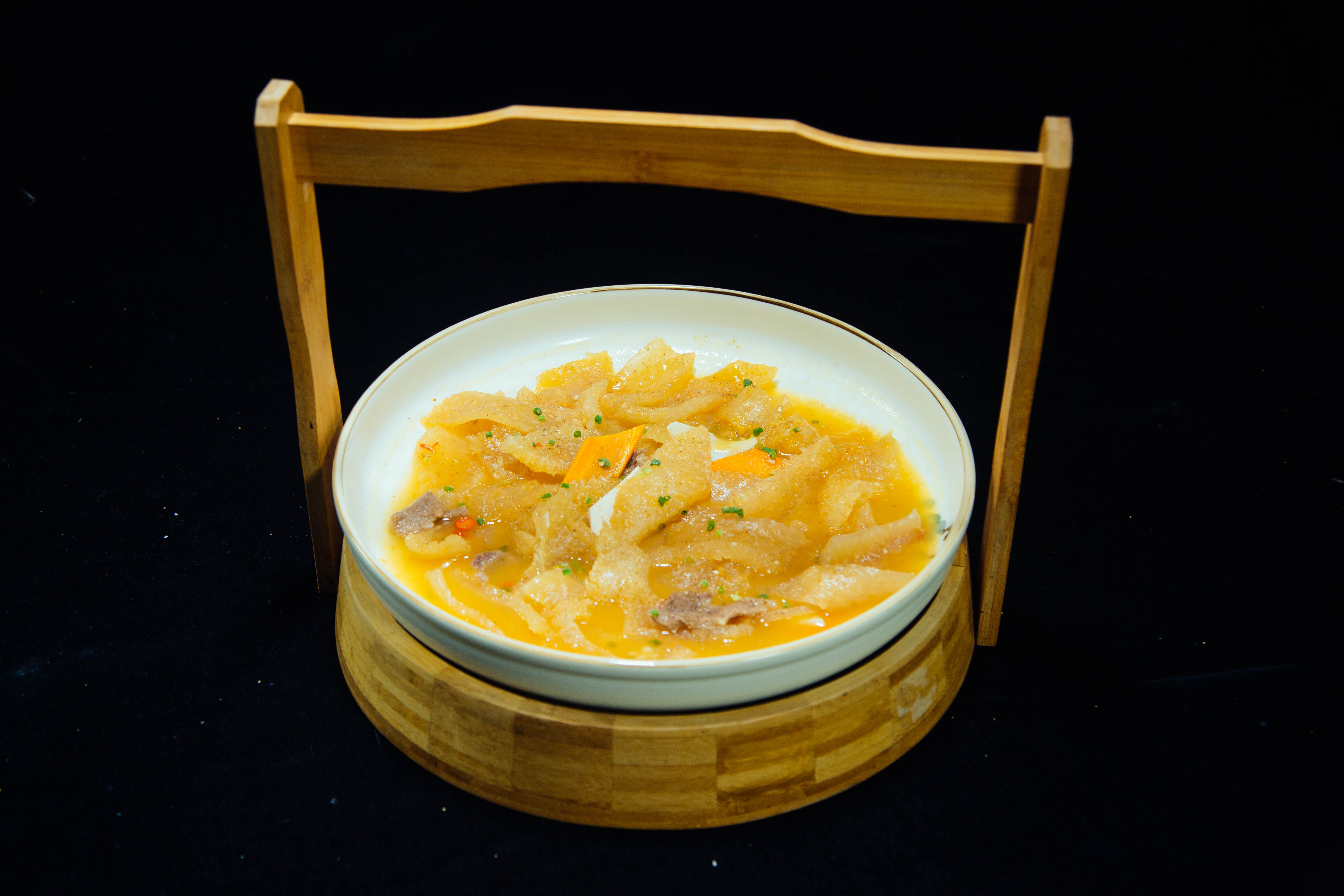 【菜肴食材】沙发干肉皮150克、瘦肉50克、净冬笋50克、高汤600克、生姜5克、葱3克、小山椒5克、地瓜粉8克、料酒3克、味精3克、白砂糖8克、胡椒粉3克、食盐5克、酱油5克、米醋15克、熟猪油9克、食用碱5克。