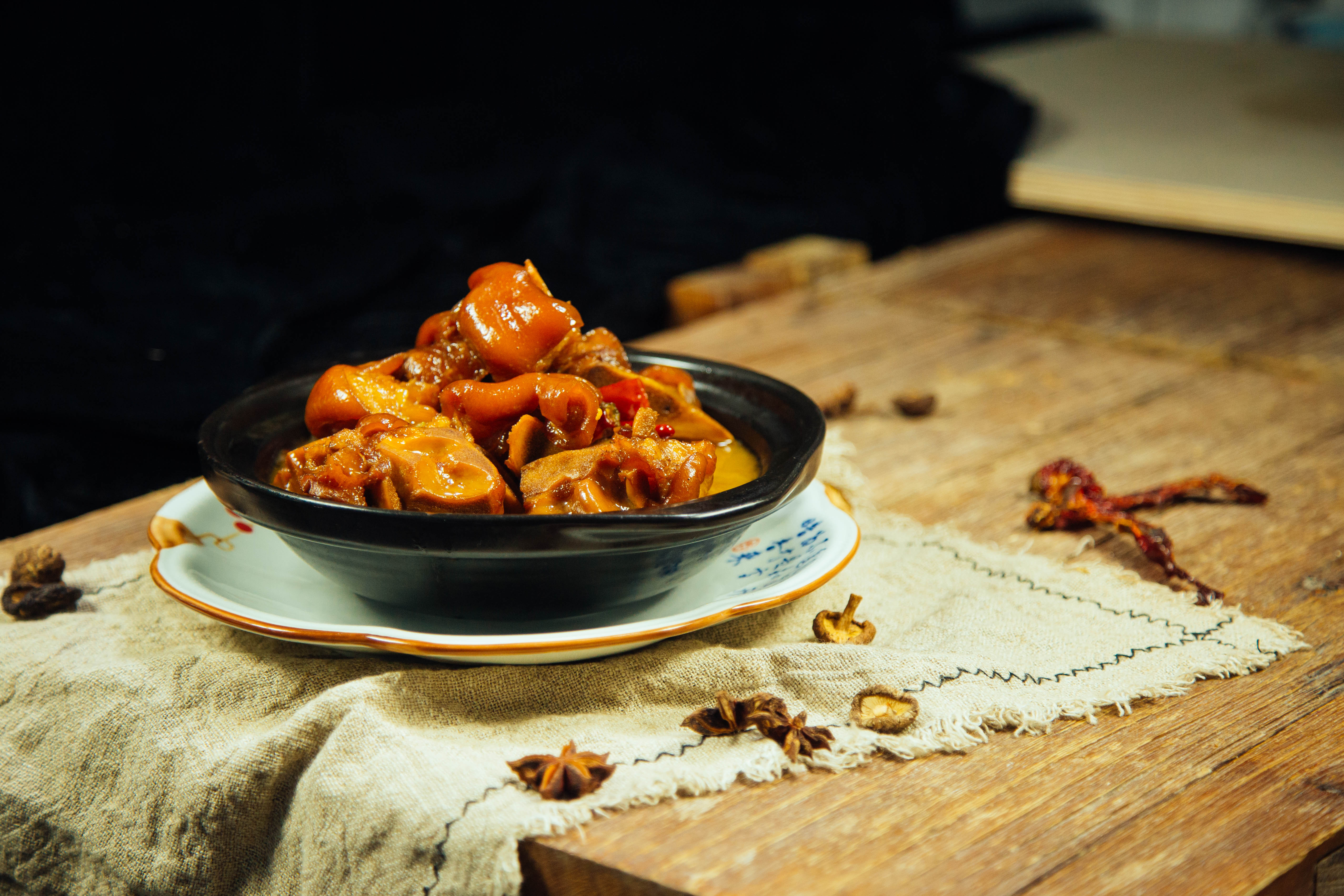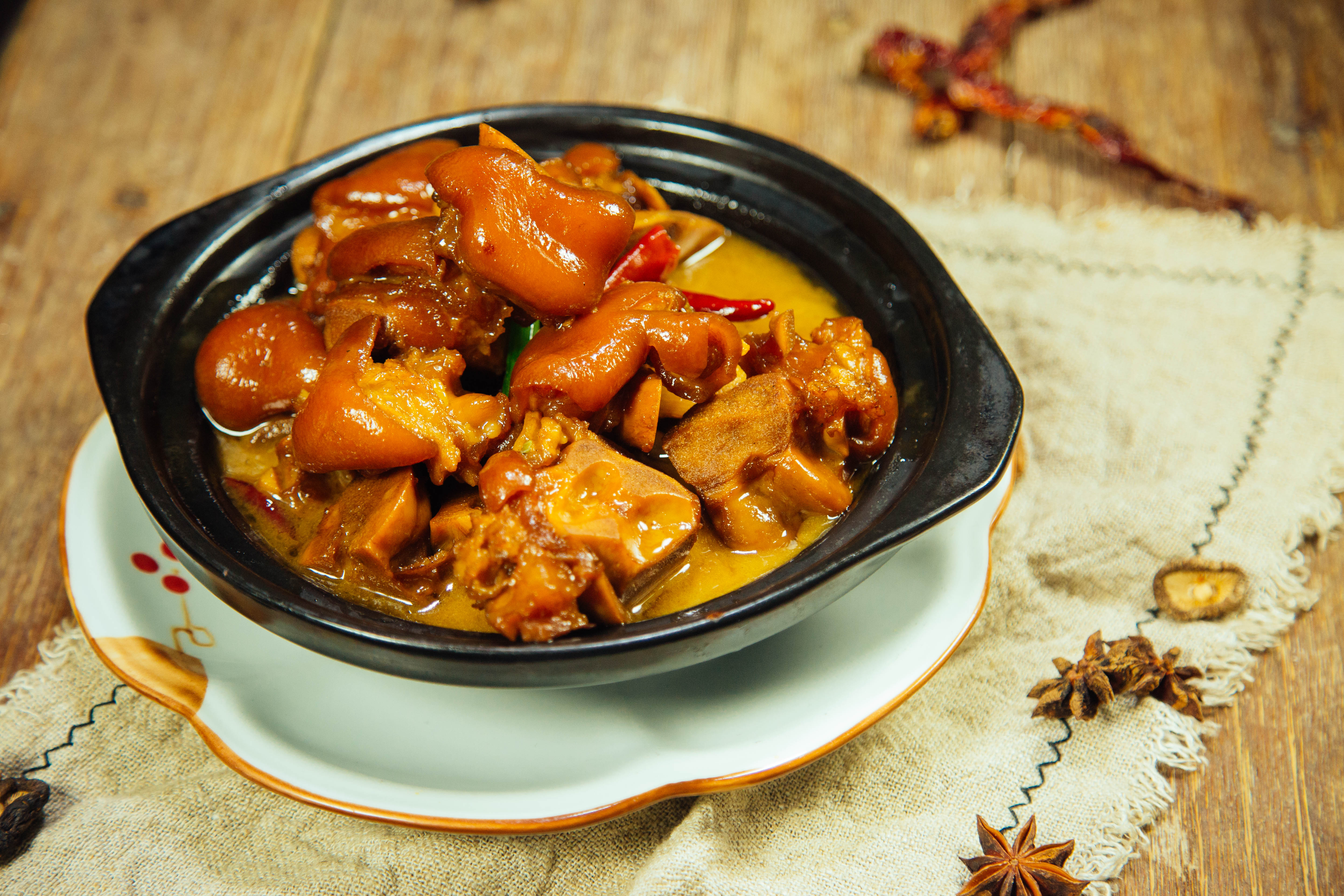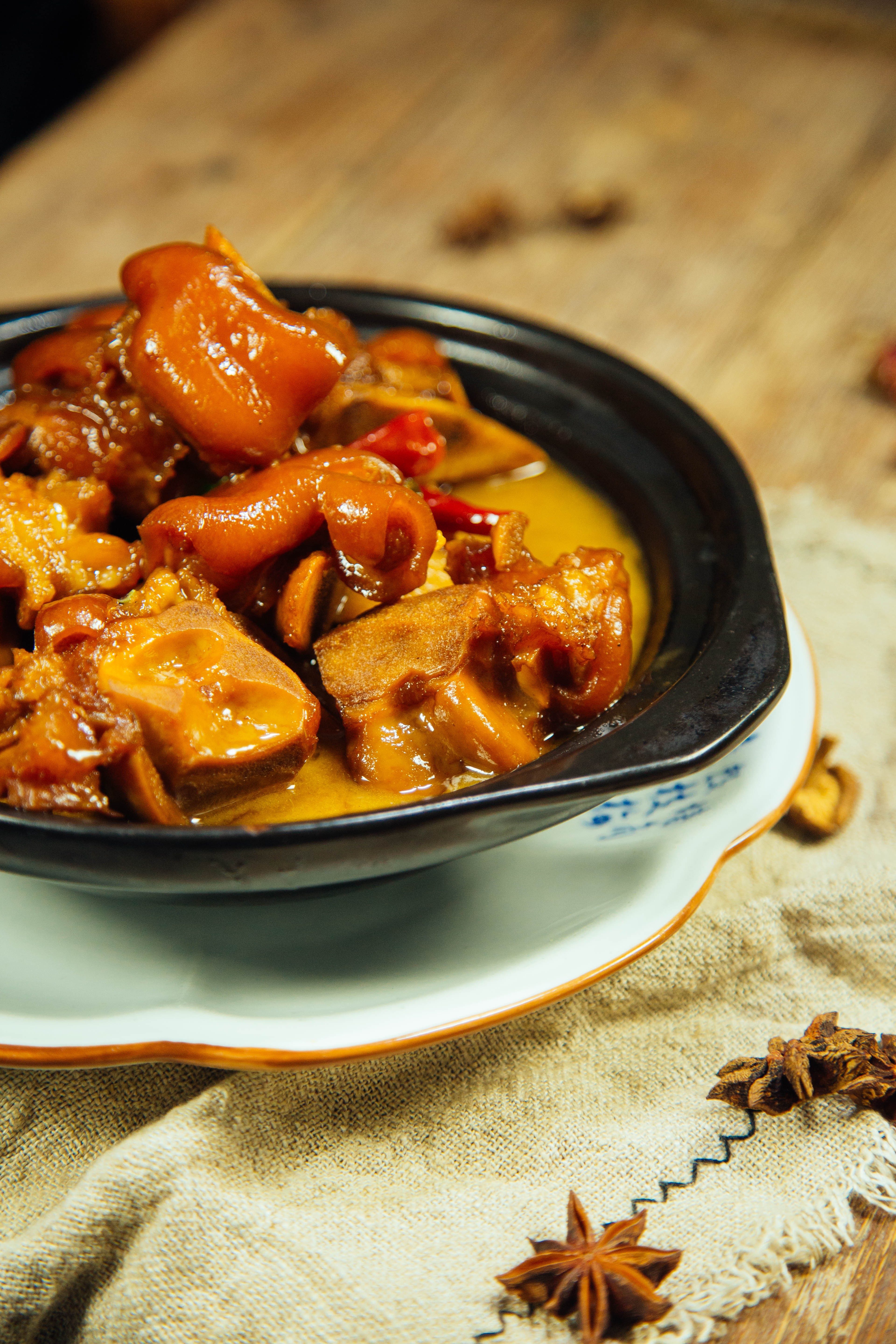 【菜肴食材】猪脚1000克、目鱼干100克、八角5克、桂叶2克、干辣椒50克、生姜50克、老抽15克、鸡精10克、精盐20克、料酒1千克、色拉油150克。