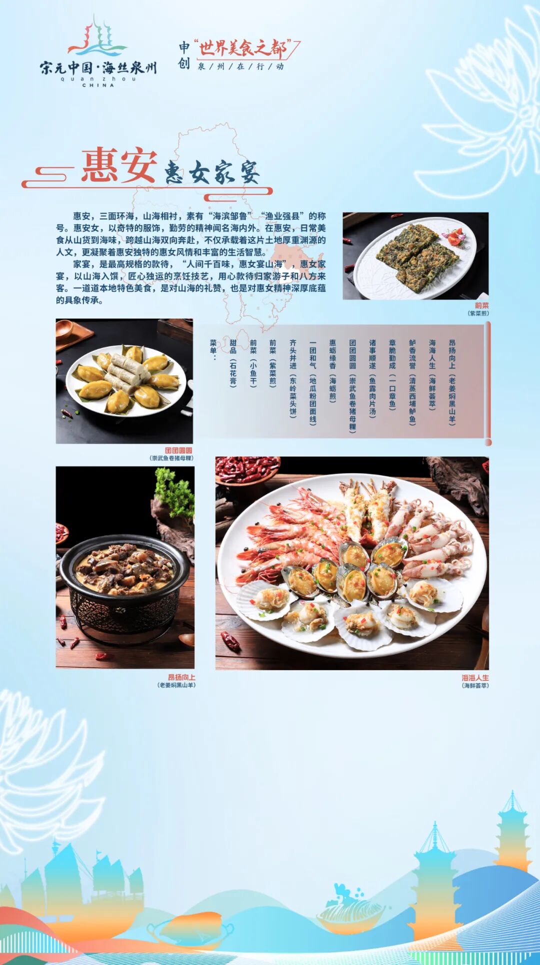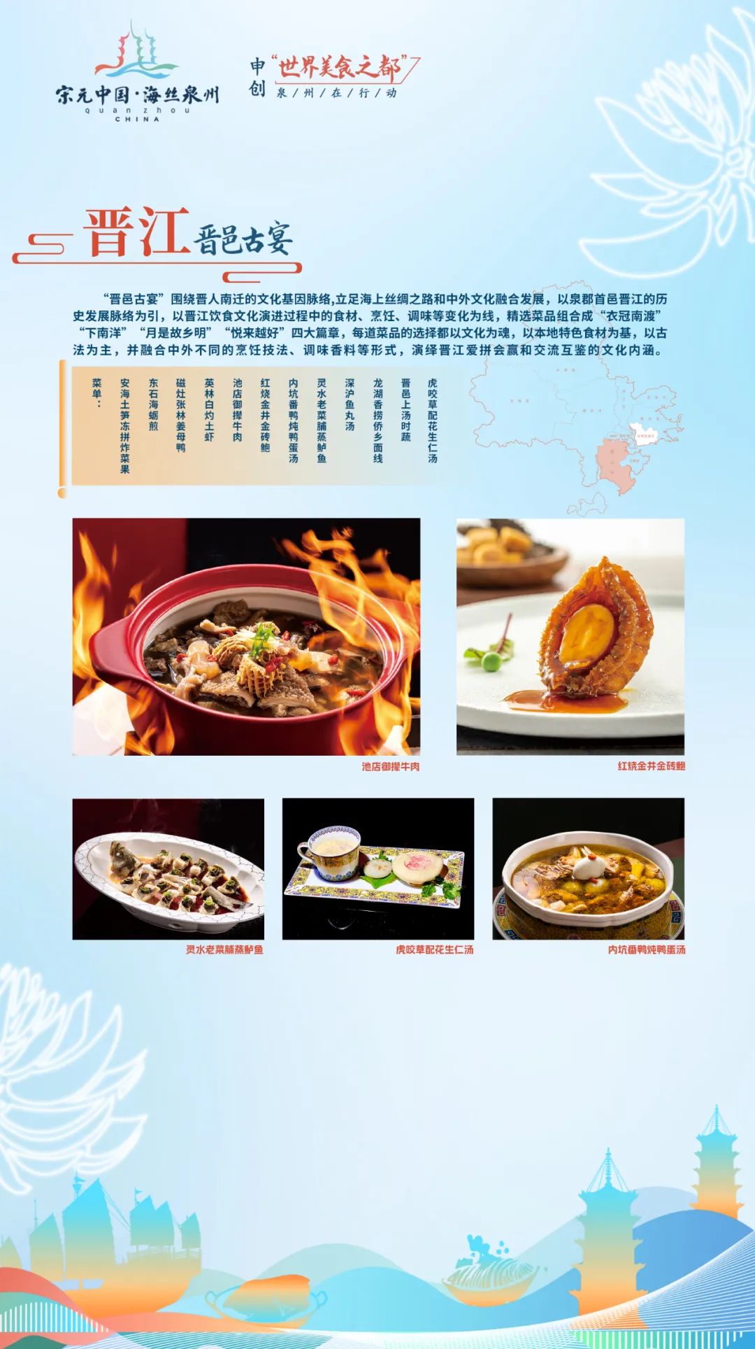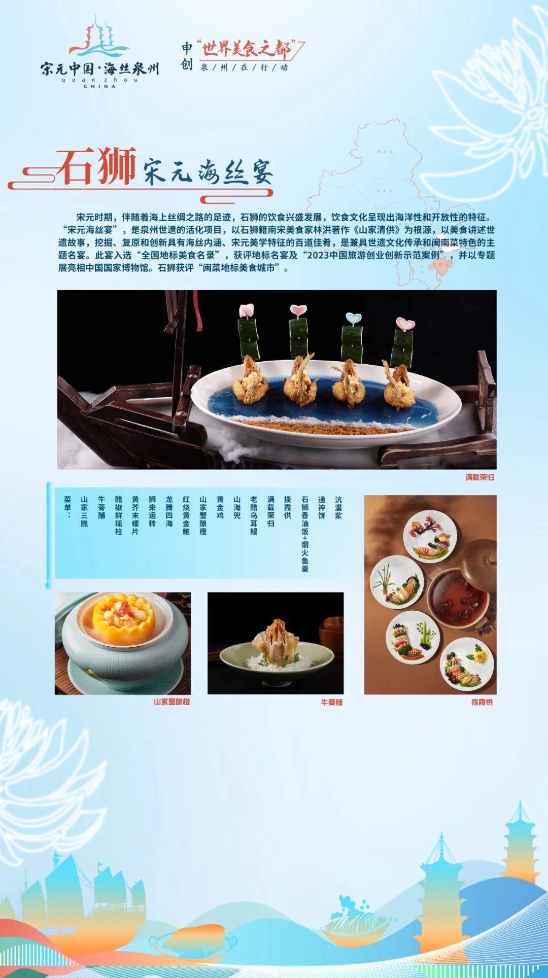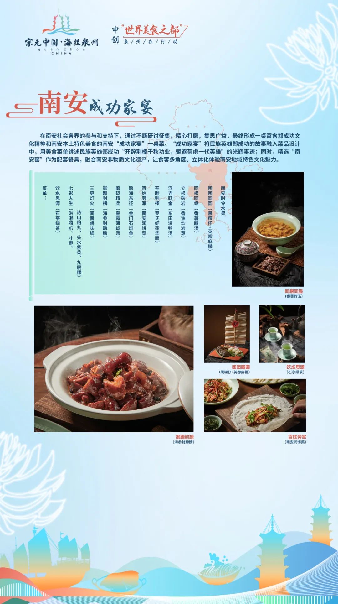 “刺桐宴”以泉州古城发展演变的时间为轴,集中原文化、闽越文化、海洋文化、南洋文化为一体,体现泉州古城作为宋元中国的世界海洋商贸中心的辉煌和魅力。