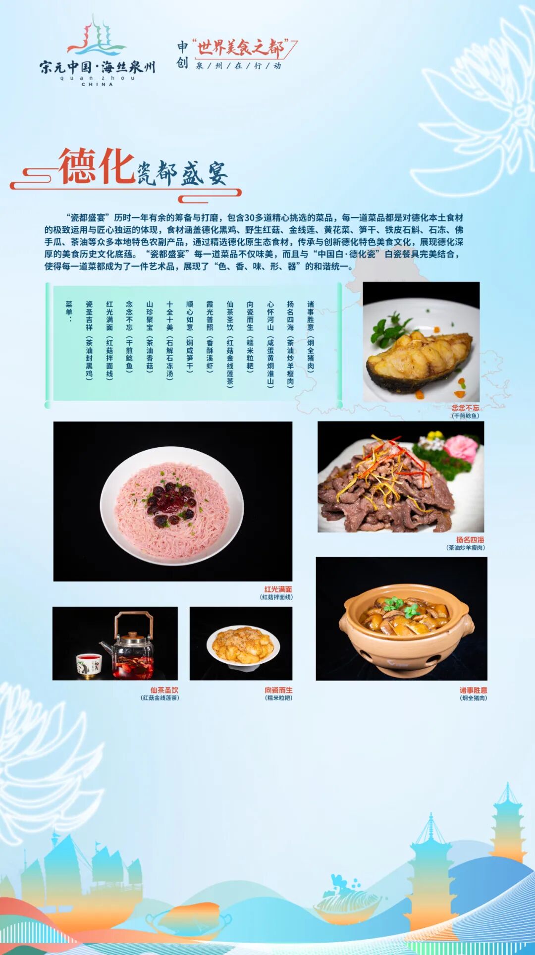 瓷都盛宴每一道菜品不仅味美,而且与“中国白·德化瓷”白瓷餐具完美结合,每一道菜“色、香、味、形、器”和谐统一。