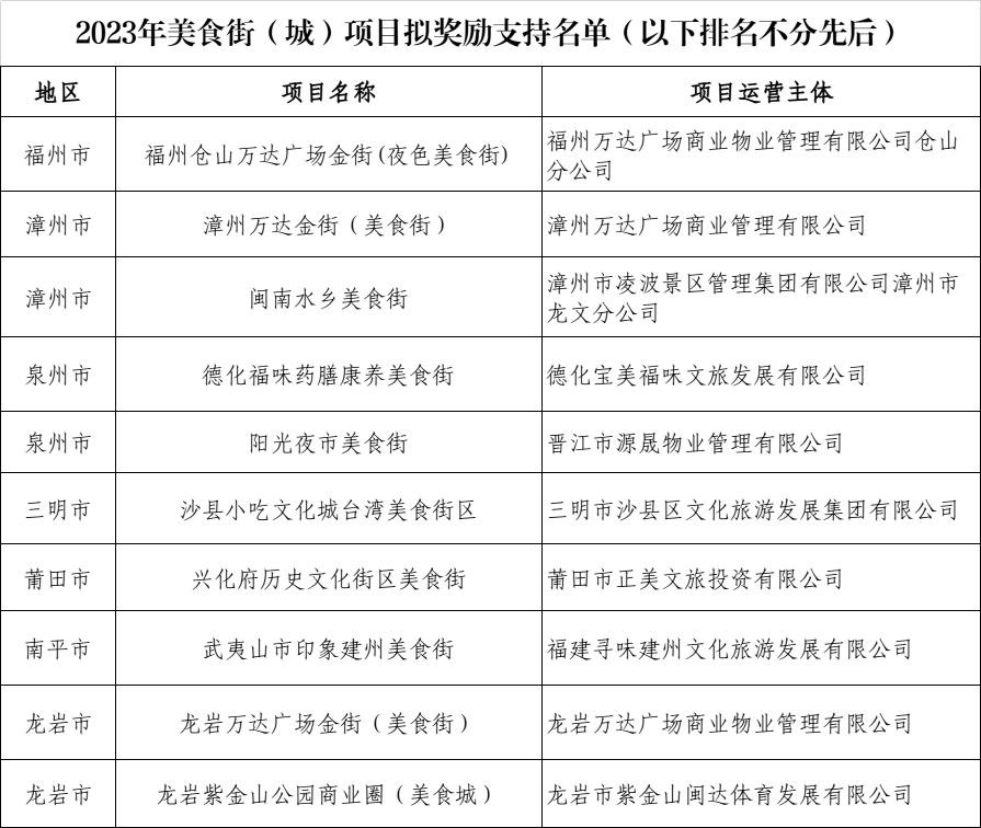 福建省财政厅关于开展2023年中央外经贸发展专项资金服务贸易方向和省级商务发展专项资金商贸服务业方向申报工作的通知》(闽商务〔2023〕86号)等文件要求,我厅组织专家对各地市商务主管部门推荐申报2023年美食街(城)的项目进行了评审,现对拟确定奖励支持名单予以公示。