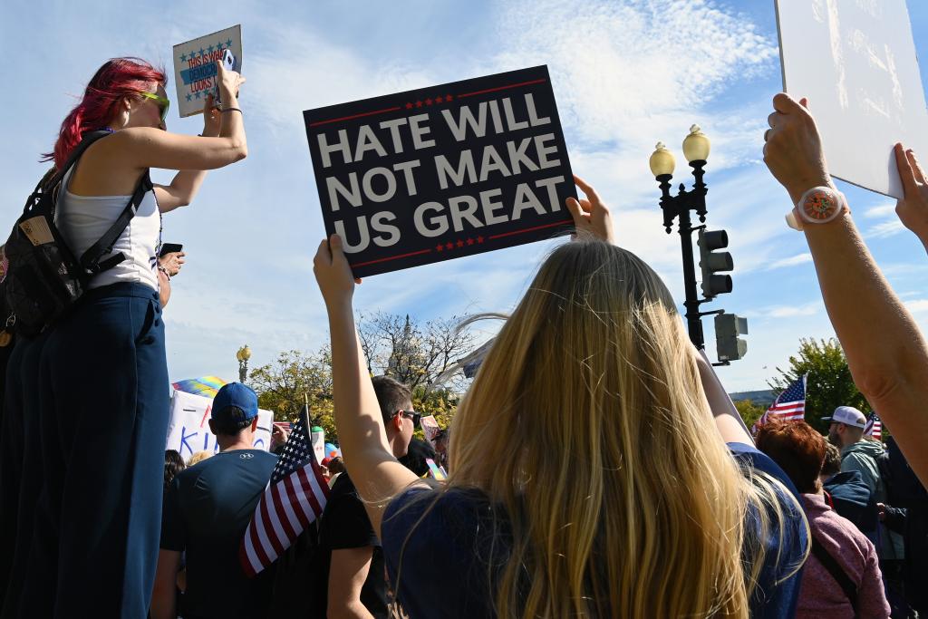 10月18日,在美国华盛顿,人们参加示威游行活动。新华社记者李睿摄