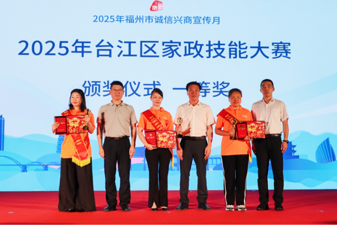 活动现场还举办了2025年台江区家政技能大赛颁奖仪式。省、市、区及商务部门领导共同为获奖家政服务人员代表颁发了荣誉证书。