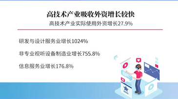 高技术产业吸收外资增长较快。高技术产业实际使用外资增长27.9%,其中,研发与设计服务业增长1024%、非专业视听设备制造业增长755.8%、信息服务业增长176.8%。