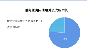 服务业实际使用外资大幅增长。服务业实际使用外资增长45.7%,占全省76%。其中,房地产业增长236.1%、信息传输和信息技术服务业增长129%、科学研究和技术服务业增长141.7%、住宿和餐饮业增长40%。