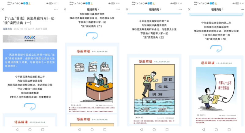 五是建设民法典法治宣传阵地。运用厅门户网站、福建商务微信公众号、厅办公大楼电子显示屏等平台开展民法典宣传。精心选择宣传内容,用漫画、图文、以案释法等形式,编发了10期的民法典学习资料,公布在厅办公内网“八五普法”专栏上,深受机关干部职工的欢迎。