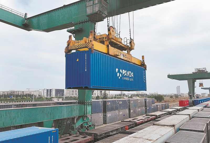 11月29日,中国铁路南昌局集团有限公司福州车务段江阴港站的中欧班列在装运集装箱。