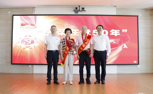 会上,黄河明书记代表厅党组为黄晓东、姚爱琴两名老党员颁发“光荣在党50年”纪念章,佩戴光荣花,对老党员为商务事业做出的贡献表示充分肯定和衷心感谢。