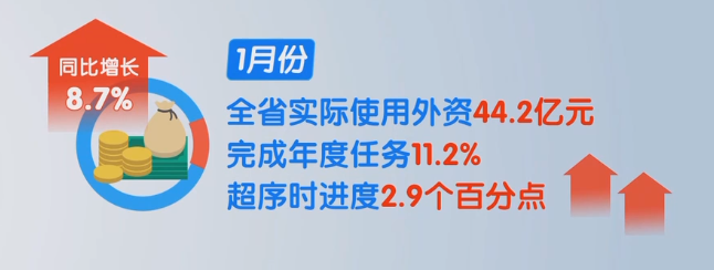 按照省委、省政府工作要求,河马剧场 持续强化招商推动,千方百计稳外资,2022年1月全省利用外资工作实现良好开局。1月份,全省实际使用外资44.2亿元人民币,同比增长8.7%,比2020年同期增长17.2%,两年平均增长8.3%,完成年度任务11.2%,超序时进度2.9个百分点。