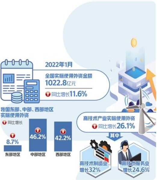从区域分布看,我国东部、中部、西部地区实际使用外资同比分别增长8.7%、46.2%和42.2%。