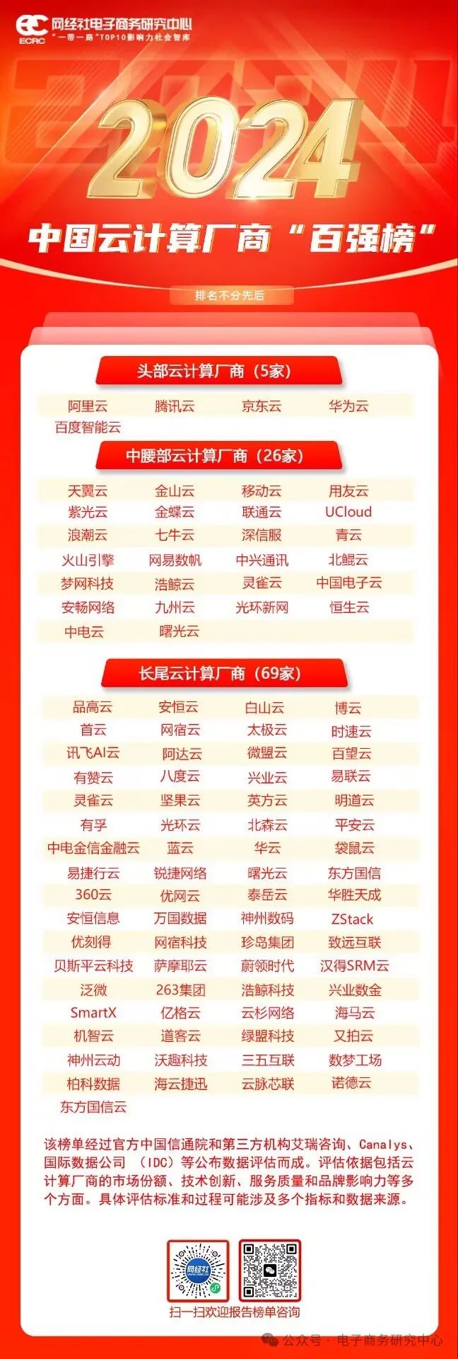 报告同期发布了《2024年中国云计算厂商“百强榜”》,今年是第三次发布,榜单根据云计算厂商市场份额与市场影响力分为:头部云计算厂商、中腰部云计算厂商、长尾云计算厂商三类,共100家厂商(排名不分先后):