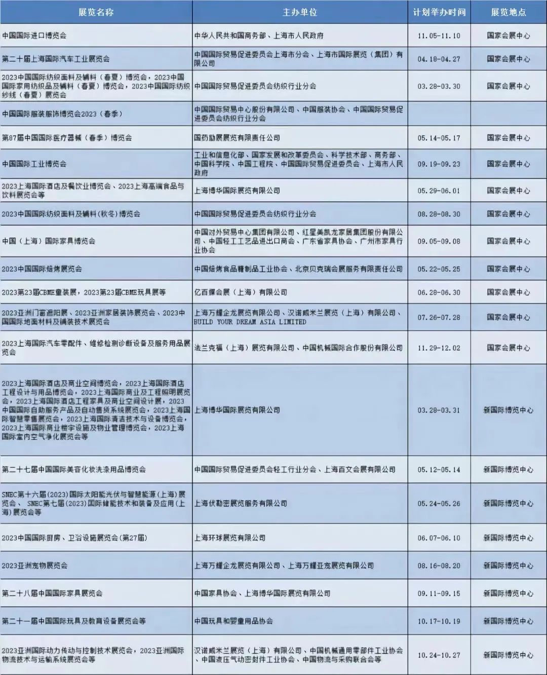 第二十届上海国际汽车工业展览会、2023中国国际纺织面料及辅料(春夏)博览会、第87届中国国际医疗器械(春季)博览会等一批重量级国际知名展会将在2023年先后亮相。