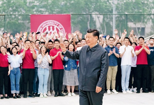 2022年4月25日上午,中共中央总书记、国家主席、中央军委主席习近平来到中国人民大学考察调研。这是习近平向师生们挥手致意。新华社记者 谢环驰/摄