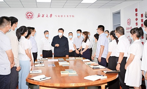 2022年7月12日至15日,中共中央总书记、国家主席、中央军委主席习近平在新疆考察。这是12日下午,习近平在新疆大学铸牢中华民族共同体意识研究基地,同师生亲切交流。新华社记者 李学仁/摄